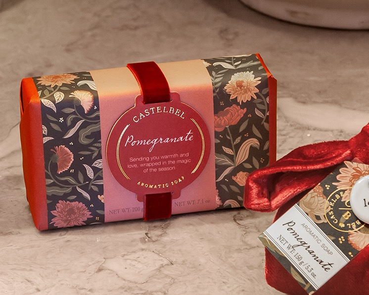 Die wunderschön verpackte Seife Granatapfel von Castelbel wird aus pflanzlichen Zutaten gefertigt und hat einen warmen fruchtigen Duft. Das dekorative Seifenpapier zeigt ein schönes Motiv aus Blüten und Blumen in edlen Farben. Als feines Detail ist die hochwertige Seife mit einem dunkelroten Samtbändchen und Medaillon aus Papier versehen.