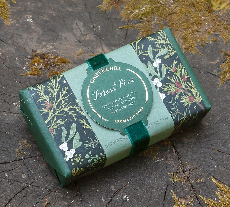 Die wunderschön verpackte Seife Pinie von Castelbel wird aus pflanzlichen Zutaten gefertigt und hat einen frischen würzigen Duft. Das dekorative Seifenpapier zeigt ein schönes Motiv aus blühenden Zweigen in edlen Farben. Als feines Detail ist die hochwertige Seife mit einem dunkelgrünen Samtbändchen und Medaillon aus Papier versehen.