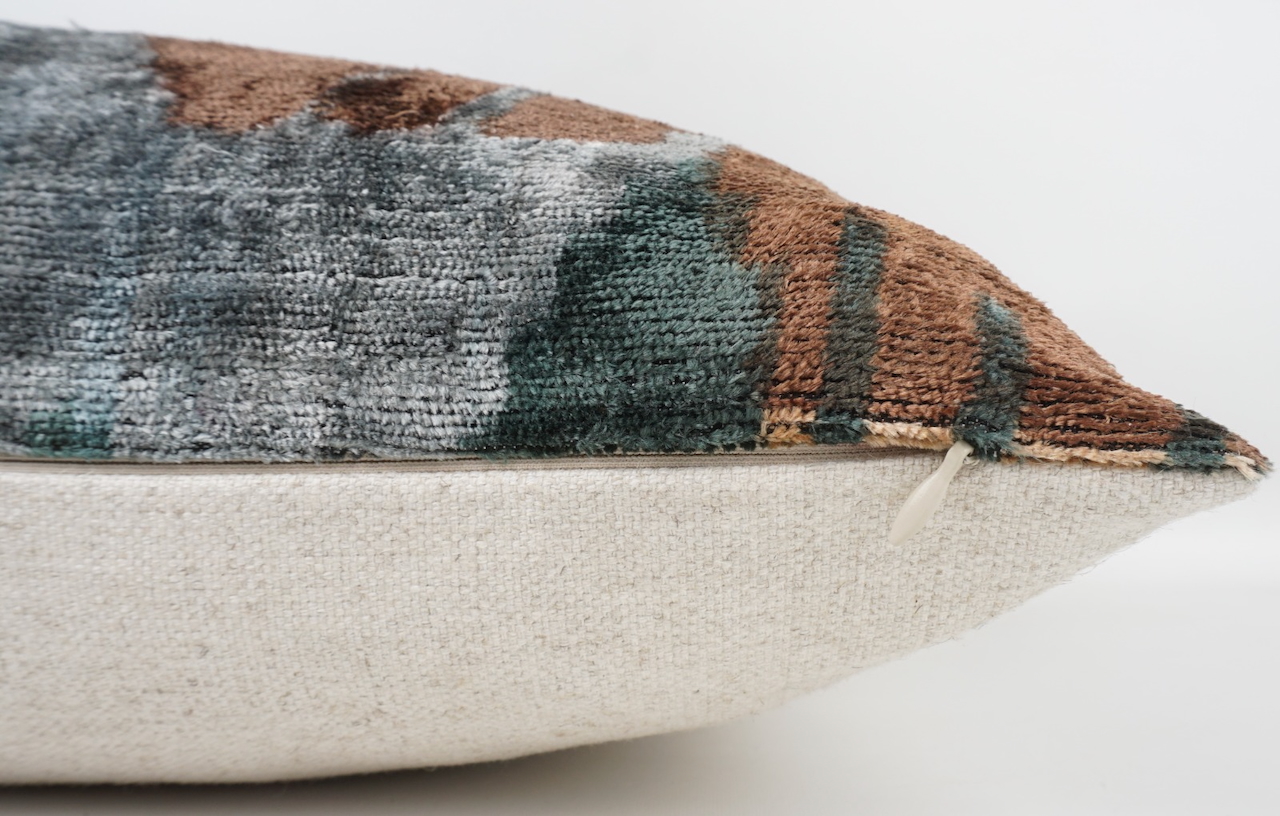 Dieses hochwertige Seidenkissen von Thanks a lot besticht durch das fein glänzende Muster in edlem Natur, Braun und Grau. Der schöne Kissenbezug wird auf der Vorderseite aus feinem Seiden-Samt und auf der Rückseite aus unifarbenem Leinen-Baumwoll-Gewebe hergestellt. Dieses edle Kissen ist ein wahres Highlight, das im Wohn- oder Schlafbereich tolle Akzente setzt und der Umgebung eine ganz besondere Note verleiht. Mit dem verdeckten schmalen Reißverschluss lässt sich der Kissenbezug dezent schließen.