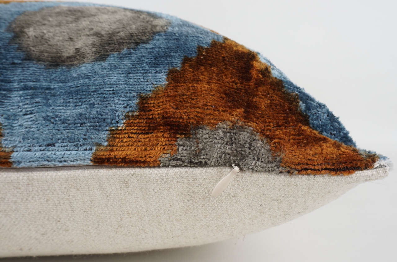 Dieses hochwertige Seidenkissen von Thanks a lot besticht durch das fein glänzende Muster in edlem Rost, Blau und Grau. Der schöne Kissenbezug wird auf der Vorderseite aus feinem Seiden-Samt und auf der Rückseite aus unifarbenem Leinen-Baumwoll-Gewebe hergestellt. Dieses edle Kissen ist ein wahres Highlight, das im Wohn- oder Schlafbereich tolle Akzente setzt und der Umgebung eine ganz besondere Note verleiht. Mit dem verdeckten schmalen Reißverschluss lässt sich der Kissenbezug dezent schließen.