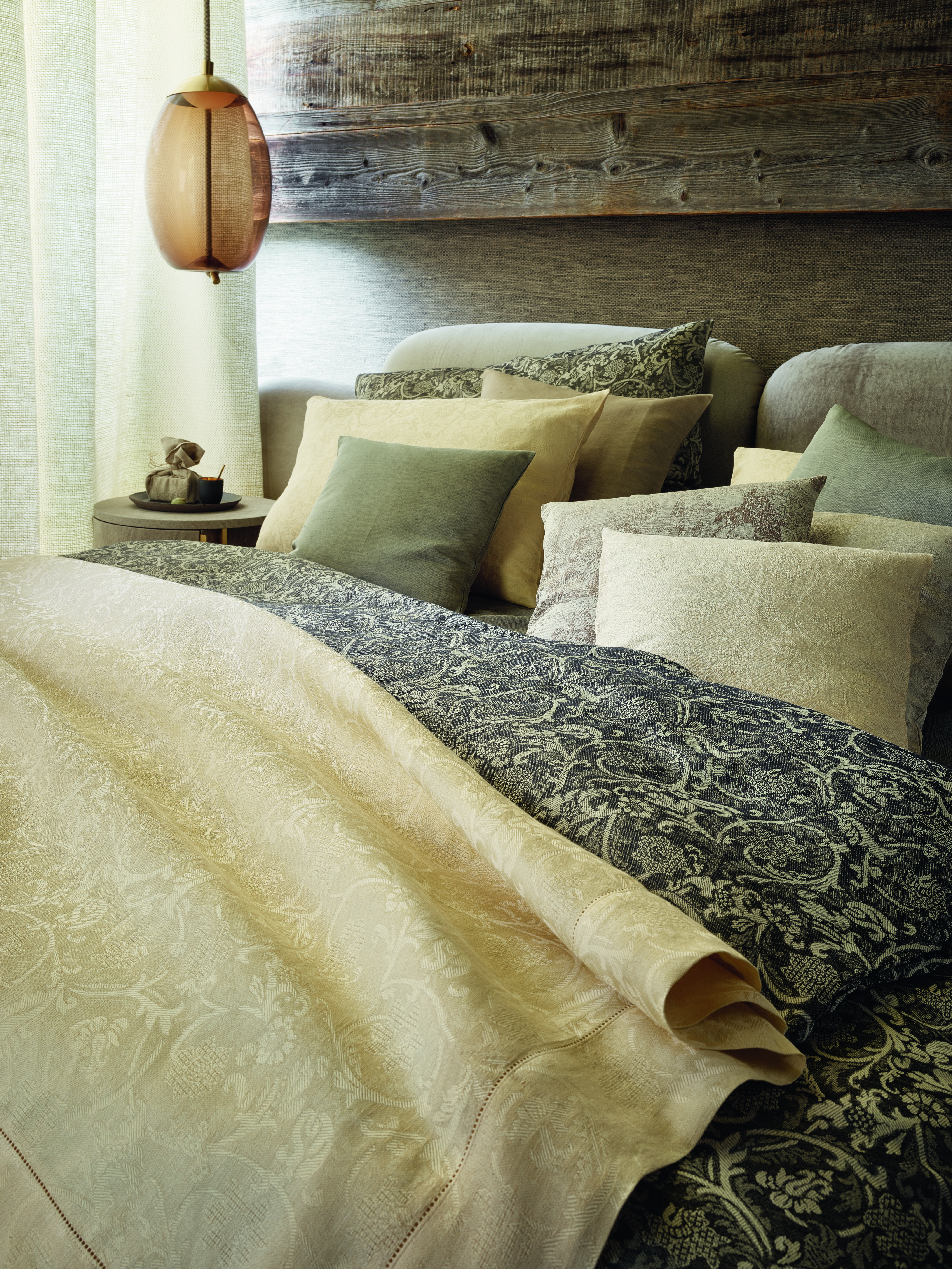 Diese dekorative Tagesdecke im Dessin Rocaille aus feiner Baumwolle und edlem Leinen von Leitner Leinen entführt in die verspielte Ornamentik des Rokoko. Die geschwungenen Rocaillen bilden ein wunderschönes Muster aus stilisierten Blättern und Ranken und sorgen für eine ganz besonders edle Optik.