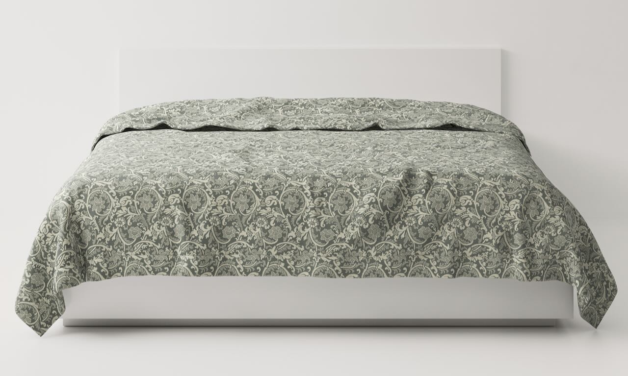 Der Stoff des schönen Bettüberwurfs ist durch die Seitennähte mit dem Vlies verbunden. Auf Anfrage kann der Bettüberwurf auch mit Punktabsteppungen gearbeitet werden, wodurch Ober- und Unterstoff an mehreren Stellen des Plaids mit dem Vlies fixiert werden. Der Besatz an den Rändern des Bettüberwurfs wird aus dem Stoff der Vorderseite genäht und ist 7 cm breit. Auf Wunsch können Vorder- und Rückseite der Tagesdecke in verschiedenen Dessins und Farben gefertigt werden.