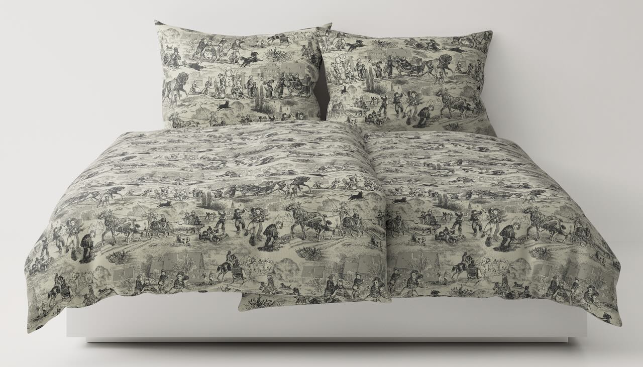 Diese schöne Bettwäsche im Dessin Toile-des-Alpes aus feiner Baumwolle und edlem Leinen von Leitner Leinen entführt in die romantische Winterszenerie der Bergwelt im 18. Jahrhundert. Eine fein gewebte Bettwäsche mit dezenten und harmonisch aufeinander abgestimmten Farben, die mit ihren winterlichen Motiven eine natürliche Leichtigkeit vermittelt.