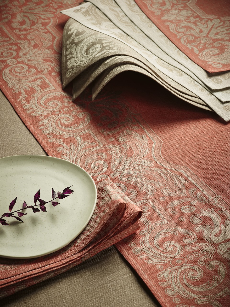 Edel und dekorativ ist diese hochwertige Serviette Marchese aus reinem Leinen von Leitner Leinen. Das wunderschön schmückende umlaufende Muster erinnert an die prachtvoll gestalteten Freskos früherer Epochen und bringt wahre Eleganz auf Tisch und Tafel. Die Wertigkeit der filigran gewebten Serviette wird durch das edel glänzende Leinen unterstrichen. Die schöne Serviette von Leitner Leinen hat einen schmalen umlaufenden Saum, wodurch das feine Dessin dezent eingefasst wird.