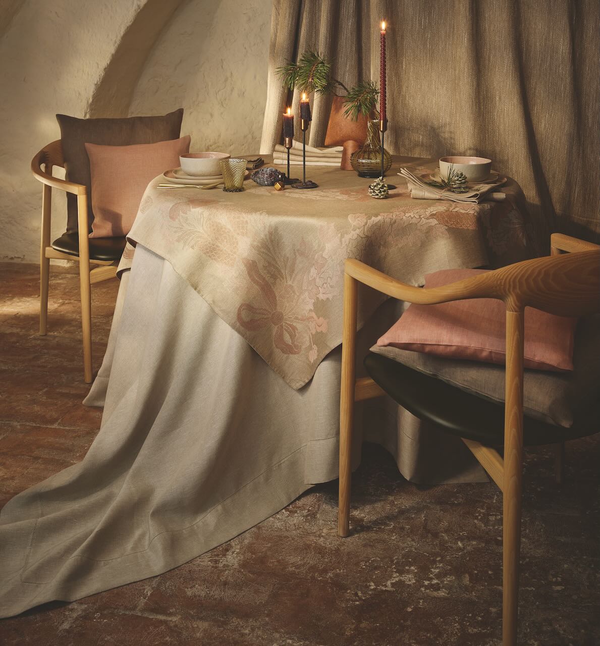 Diese schöne Tischdecke von Leitner Leinen im Dessin Girlande aus Reinleinen verzaubert mit verspielten Schleifen und winterlichen Zweigen die festlich gedeckte Tafel. Die fein gewebten Blätter, Zapfen und Schleifen verzieren die hochwertige Tischdecke auf ganz besondere Weise. Der schöne Glanz des Reinleinen unterstreicht die Wertigkeit des exklusiven Tischtuchs. Das schöne Tischtuch wird mit einem schmalen Saum gefertigt.