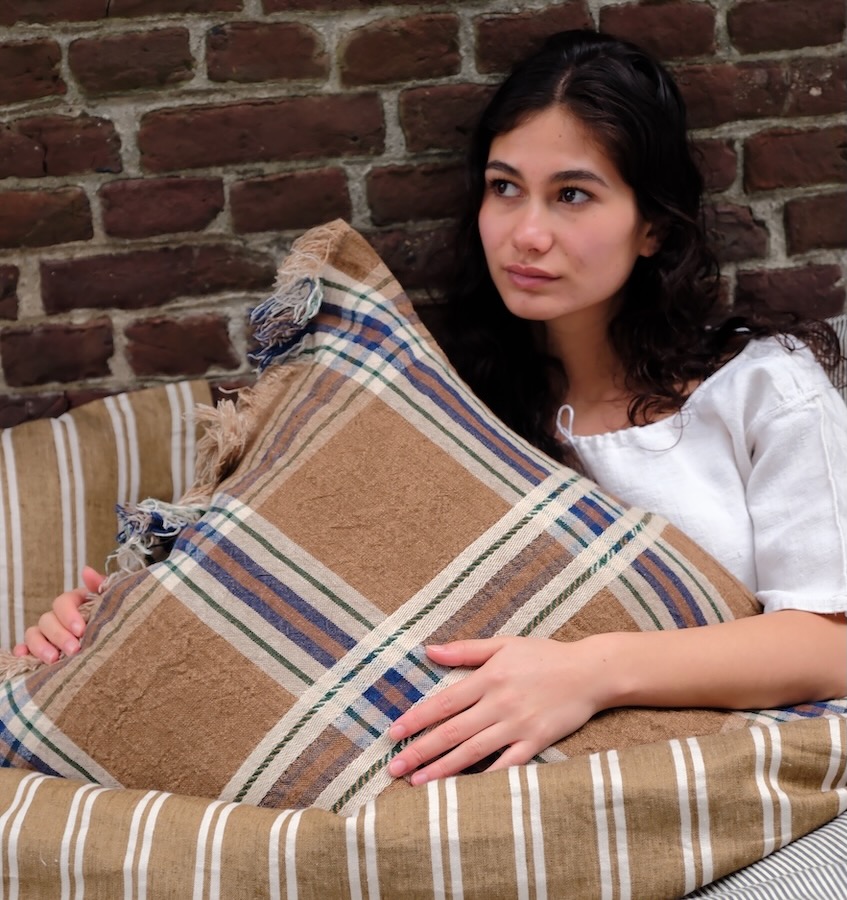 Der dekorative Kissenbezug Batsi von Libeco ist edel und lässig zugleich Durch das vorgewaschene Leinen ist der schöne Kissenbezug angenehm weich und und hat einen besonders feinen Glanz. Das schöne Karomuster aus edlem Ingwer in Kombination mit Indigo, Grün, Braun und Natur und das fein schimmernde Leinen wirken bei diesem tollen Karokissen sportlich und edel zugleich. Der Kissenbezug hat an zwei Seiten lässige Fransen wird mit einem dezenten Reißverschluss geschlossen.