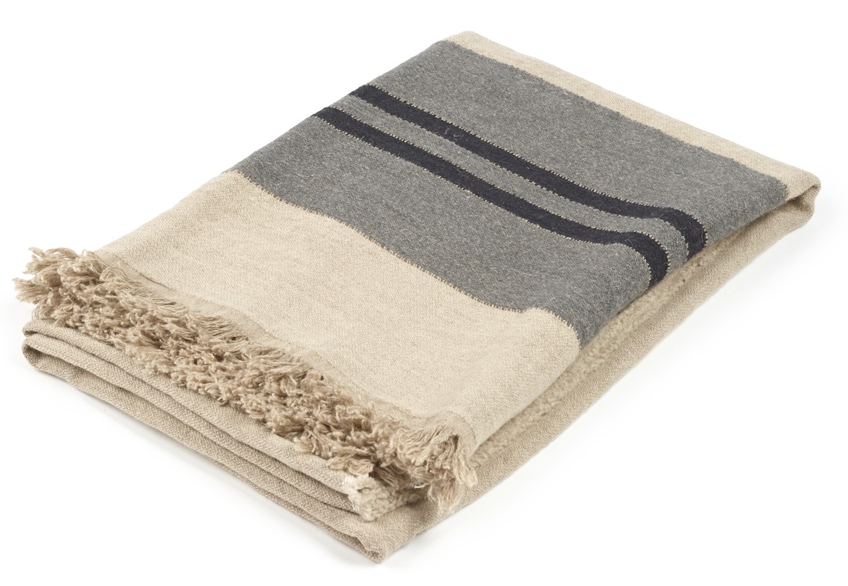 Dieses schöne Plaid von Libeco besticht durch die edle Farbkombination warmem Natur und edlem Grau und Schwarz. Die kleinere Decke hat an den Enden einen breiten grauen und einen schwarzen Streifen, die jeweils durch graue oder schwarze Streifen durchbrochen werden, das große Plaid hat an beiden Enden die grauen und in der Mitte den schwarzen Streifen. Das hochwertige Plaid ist aus einer gewaschenen Leinen-Wollmischung gewebt und hat eine angenehme Gewebestruktur mit weicher Oberfläche. Durch die hellen Fransen erhält die schöne Decke eine edel lässige Optik. Das große Plaid hat eine Mittelnaht.