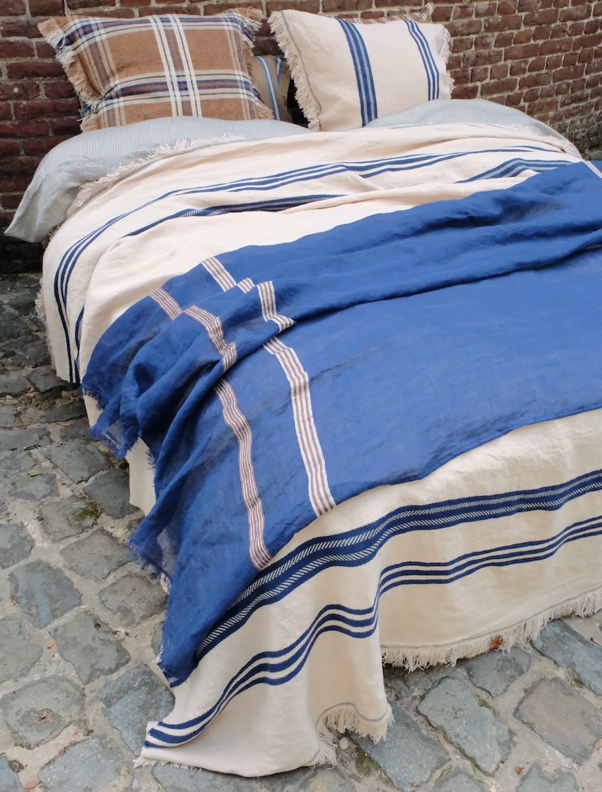Diese lässige Tagesdecke bzw. Tischdecke von Libeco ist edel, sportlich und klassisch. Das hochwertige Plaid hat hat einen naturfarbenen Grundton mit zwei unterschiedlich gewebten indigofarbenen Streifen jeweils am Kopf- und Fussende. Das gewaschene Leinen der hochwertigen Decke hat einen leicht schimmernden Glanz und ist angenehm weich und anschmiegsam. Die dekorativen Fransen an Kopf- und Fussende unterstreichen die edle Lässigkeit der schönen Tagesdecke oder Tischdecke von Libeco. Bei der Größe 280x230 cm verläuft eine Mittelnaht vom Kopf- zum Fussende.