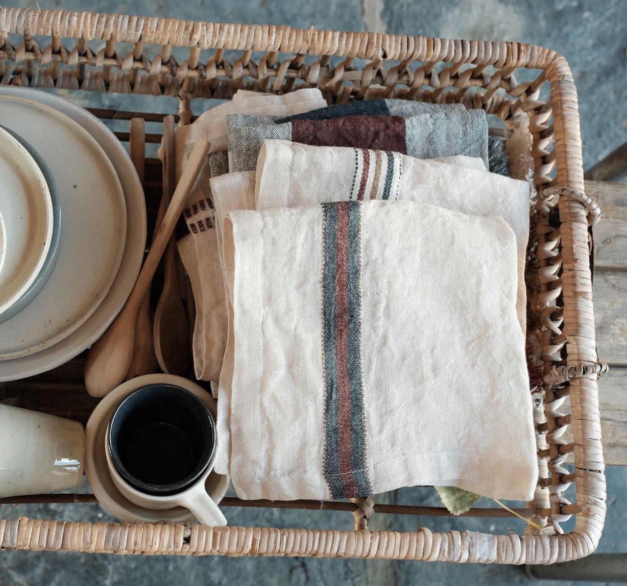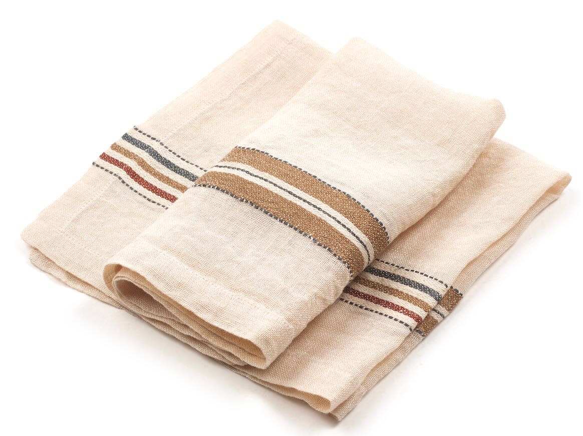 Diese leicht gewebte Serviette von Libeco setzt mit ihren unterschiedlichen Streifen in Eichenbraun, Rostbraun und Grau-Blau auf naturfarbenem Grund ganz besondere Akzente. Die dekorative Serviette wird aus hochwertigem gewaschenen Leinen gewebt und wirkt durch ihre feine Verarbeitung wie handgewebt. Eingefasst wird sie mit einem Briefeckensaum. Die Mindestbestellmenge beträgt 6 Stück.