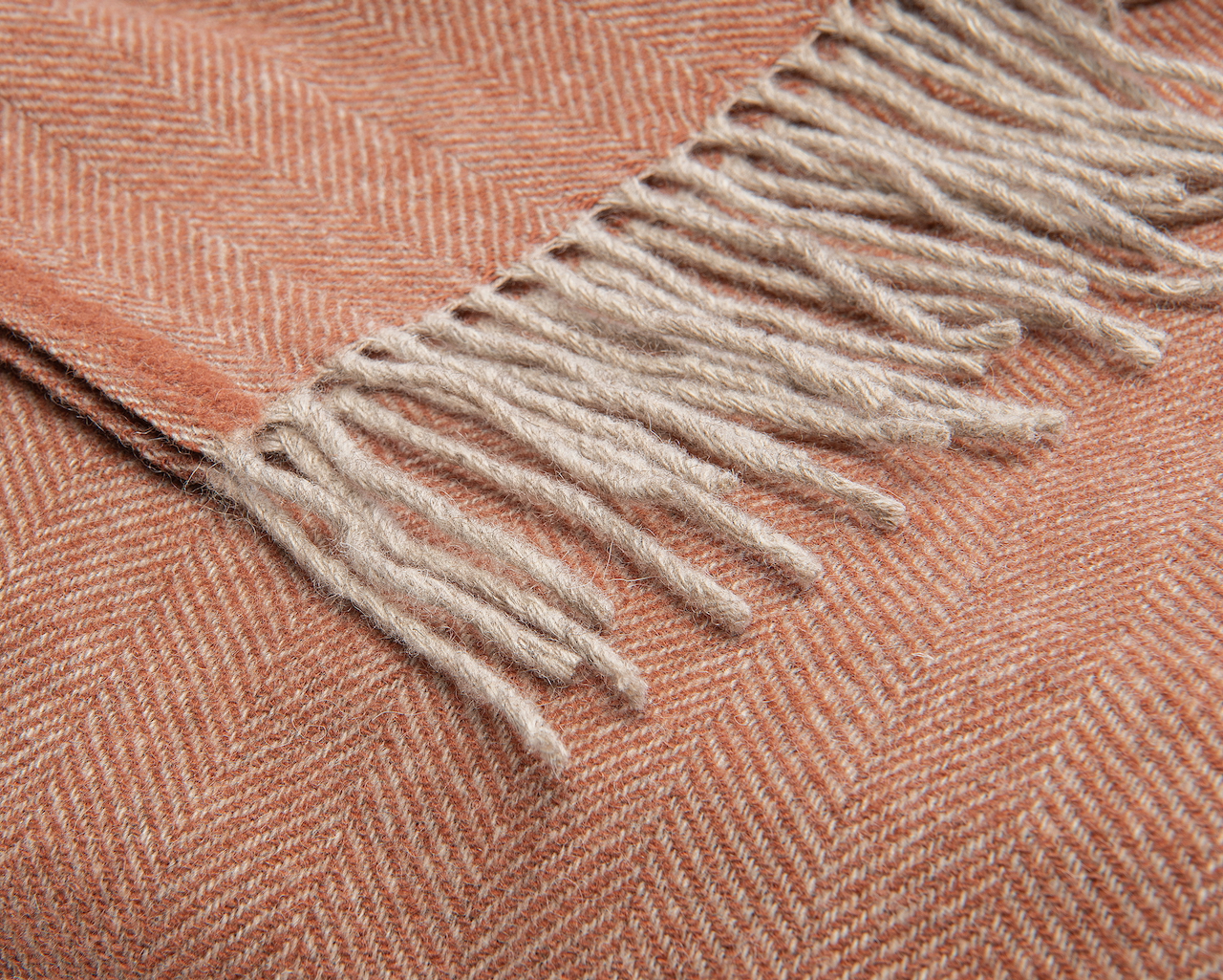 Die dekorative Wolldecke Classic aus reiner Merinowolle von Thanks a lot ist angenehm leicht und wärmend und besticht durch ihren warmen Caramelton. Durch das Fischgrät-Muster, hat diese hochwertige Decke einen leichten Melange-Effekt und wirkt besonders lebendig. Die naturfarbenen Fransen verleihen der Decke eine lässige Note. Eine schöne und dekorative Wolldecke für kühlere Stunden, die dezente Akzente zu setzten vermag. Die Länge der Decke bemisst sich inklusive der Fransen.