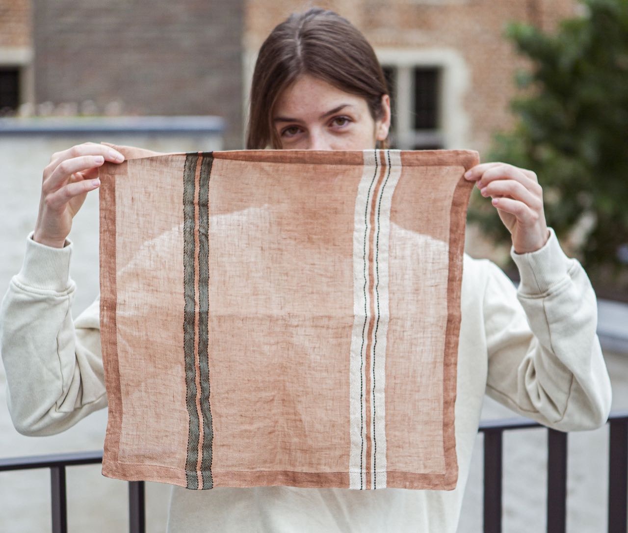 Diese offen gewebte Serviette von Libeco setzt mit ihren dekorativen schwarzen, salbeigrünen und naturfarbenen Streifen auf braunem Grund besonders edle Akzente. Die dekorative Serviette wird aus hochwertigem gewaschenen Leinen gewebt und wirkt durch ihre feine Verarbeitung wie handgewebt. Eingefasst wird sie mit einem Briefeckensaum. Die Mindestbestellmenge beträgt 6 Stück.