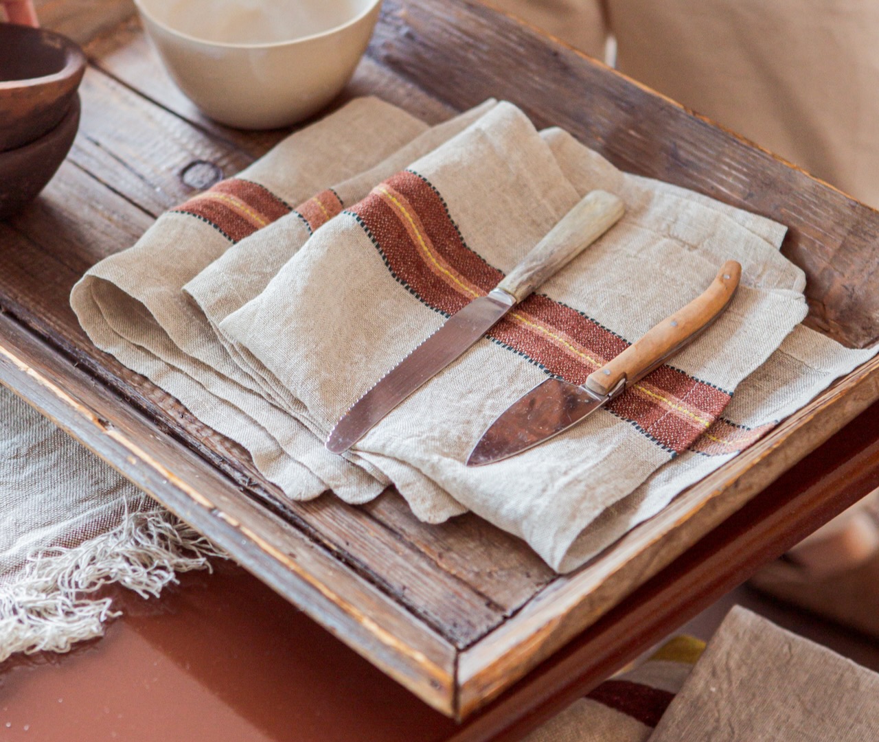 Diese offen gewebte Serviette von Libeco setzt mit ihren unterschiedlichen Streifen in Lederbraun, Altrosa, Tannengrün und Senfgelb auf flachsfarbenem Grund besonders edle Akzente. Die dekorative Serviette wird aus hochwertigem gewaschenen Leinen gewebt und wirkt durch ihre feine Verarbeitung wie handgewebt. Eingefasst wird sie mit einem Briefeckensaum. Die Mindestbestellmenge beträgt 6 Stück.