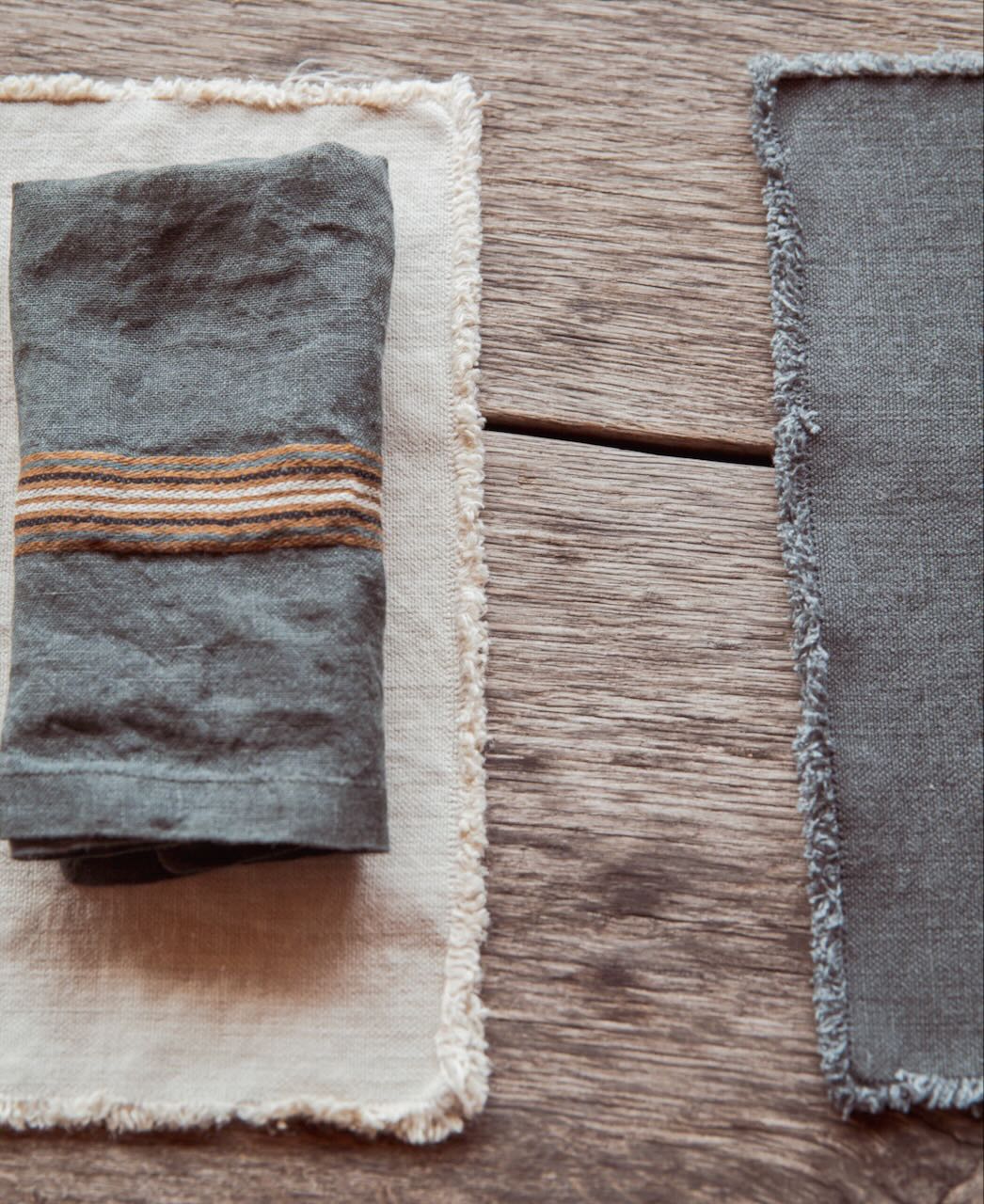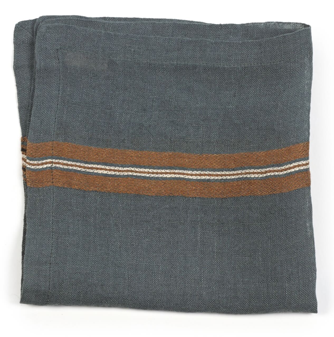 Diese offen gewebte Serviette von Libeco setzt mit ihren dekorativen braunen, schwarzen und naturfarbenen Streifen auf grün-grauem Grund besonders edle Akzente. Die dekorative Serviette wird aus hochwertigem gewaschenen Leinen gewebt und wirkt durch ihre feine Verarbeitung wie handgewebt. Eingefasst wird sie mit einem Briefeckensaum. Die Mindestbestellmenge beträgt 6 Stück.
