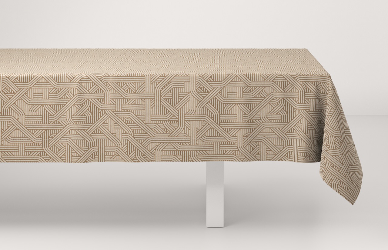 Diese edle Tischdecke aus Reinleinen von Leitner Leinen im modernen Dessin Confusion wird geprägt durch das raffiniert gewebte Muster, bei dem Kordelstränge einem gordischen Knoten gleich über- und untereinander zu laufen scheinen. Sie verlaufen diagonal, horizontal oder vertikal und verflechten sich ineinander wie das Leinen beim Weben selbst und verleihen der hochwertigen Tischdecke eine gradlinige Optik.