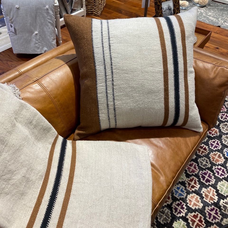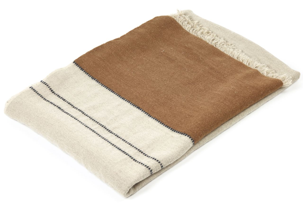 Dieses exklusive Plaid von Libeco mit Grundton warm weiß ist ausgefallen und schön. Die edle Decke hat auf der einen Seite einen breit abgesetzten Rand in Braun, worauf drei Streifen in braun und schwarz auf der anderen Seite Bezug nehmen. Die gewaschene Leinen-Wollmischung hat eine grobe Gewebestruktur und verleiht der hochwertigen Decke eine weiche angenehme Oberfläche. Die Fransen verleihen der edlen Decke eine schöne lässige Optik. Ein schönes Plaid für alle Wohnbereiche.