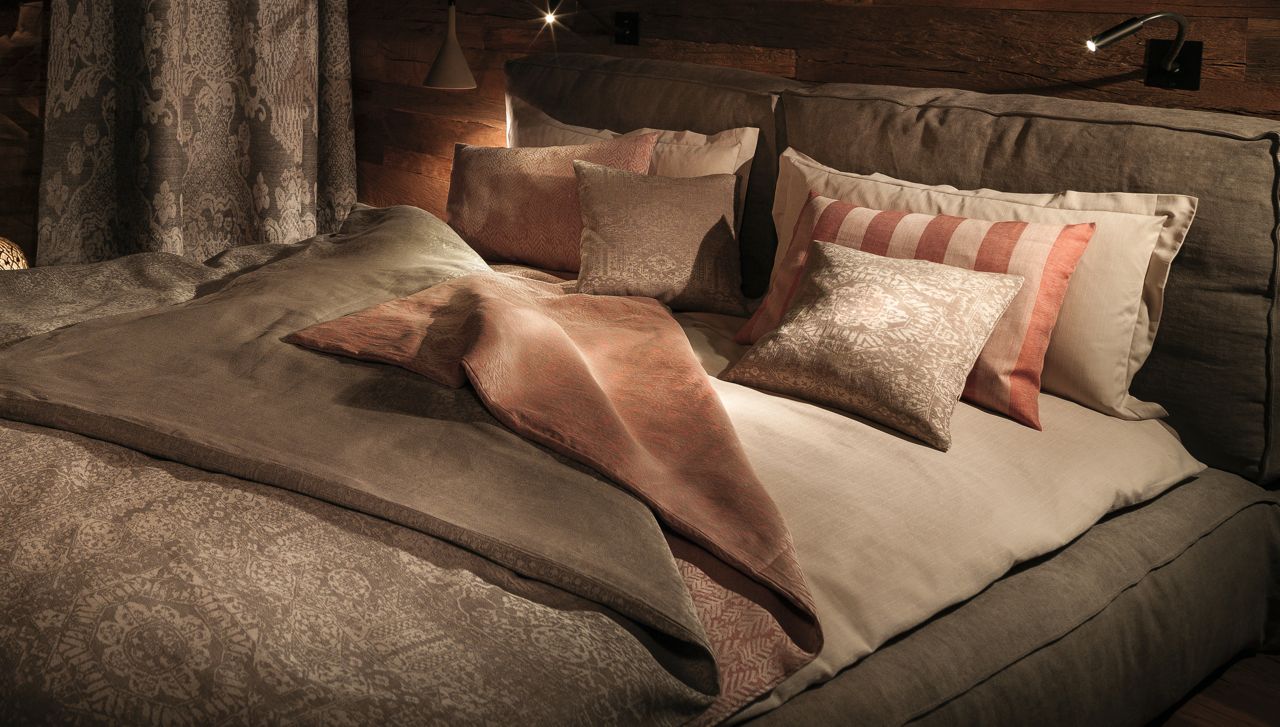 Der Stoff des hochwertigen Bettüberwurfs ist durch die Seitennähte mit dem Vlies verbunden. Auf Anfrage kann der Bettüberwurf auch mit Punktabsteppungen gearbeitet werden, wodurch Ober- und Unterstoff an mehreren Stellen des Plaids mit dem Vlies fixiert werden. Der Besatz an den Rändern des Bettüberwurfs wird aus dem Stoff der Vorderseite genäht und ist 7 cm breit. Auf Wunsch können Vorder- und Rückseite der Tagesdecke in verschiedenen Dessins und Farben gefertigt werden.