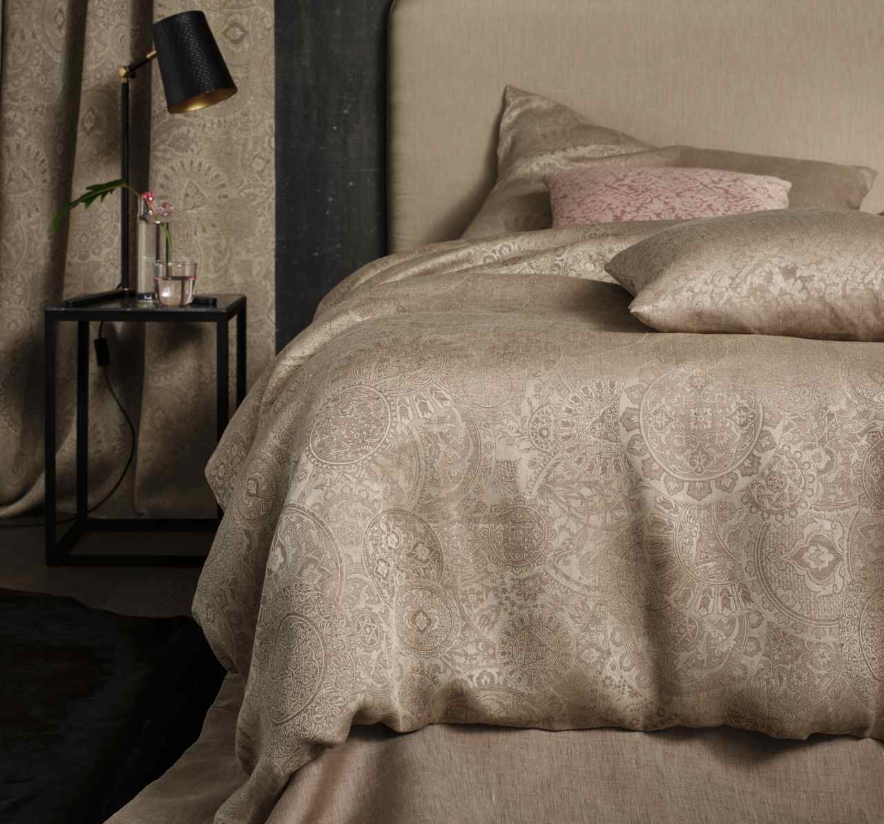 Diese kunstvoll gewebte Tagesdecke von Leitner Leinen im Dessin Intarsio aus Reinleinen zeigt den Reichtum der Natur in ihrer floralen Vielfalt. Stilisierte Rosen, Tulpen und Gerbera, verbunden durch geschwungene Rauten, Ranken und filigrane Ornamente, kommen durch die fein aufeinander abgestimmten Farben besonders schön zur Geltung und verleihen dem edlen Bettüberwurf eine zurückhaltende Eleganz.