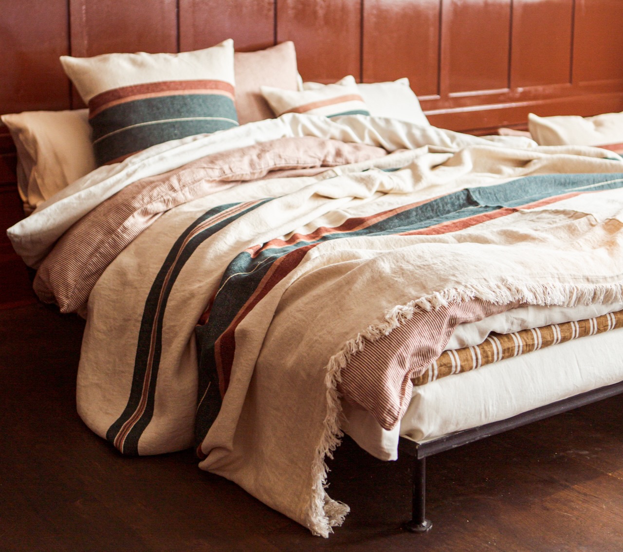 Diese exklusive Tagesdecke von Libeco ist lässig, sportlich und edel. Das hochwertige Plaid hat hat einen naturfarbenen Grundton mit zwei verschieden breiten Streifen, die sich aus den Farben Grün, Braun, Senf und Rosa zusammensetzen. Das gewaschene Leinen der hochwertigen Decke hat einen leicht schimmernden Glanz und ist angenehm weich und anschmiegsam. Die dekorativen Fransen und eine Mittelnaht unterstreichen die edle Lässigkeit der schönen Tagesdecke von Libeco.