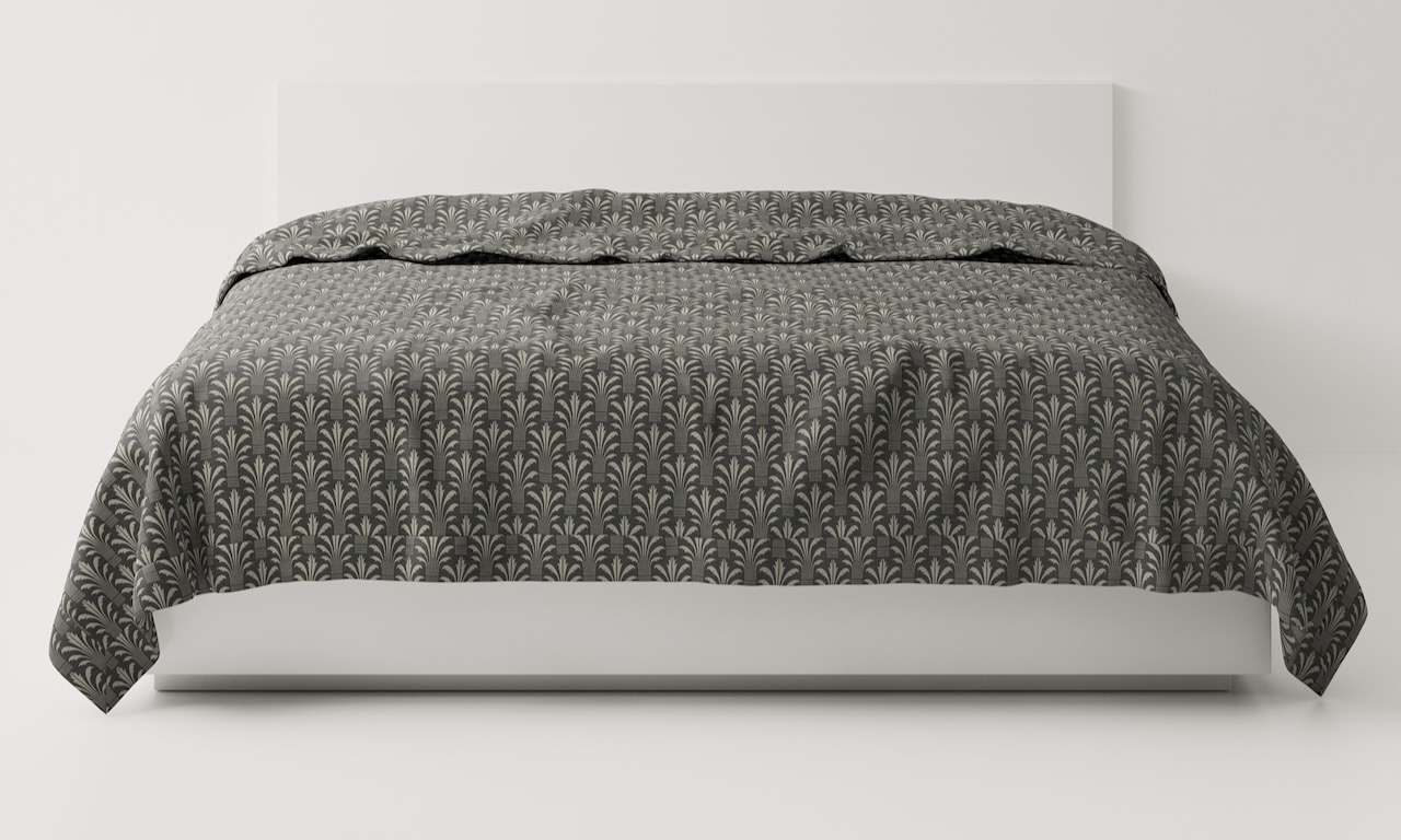 Diese edle Tagesdecke von Leitner Leinen im Dessin Diana aus Halbleinen besticht durch das an das Art-Deco angelehnte stilisierte Palmenmuster, das durch seine filigrane Webart eine wunderschöne Wirkung entfaltet und eine ganz besondere Eleganz ausstrahlt.