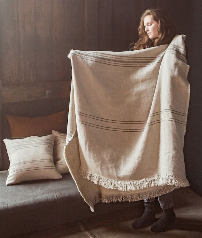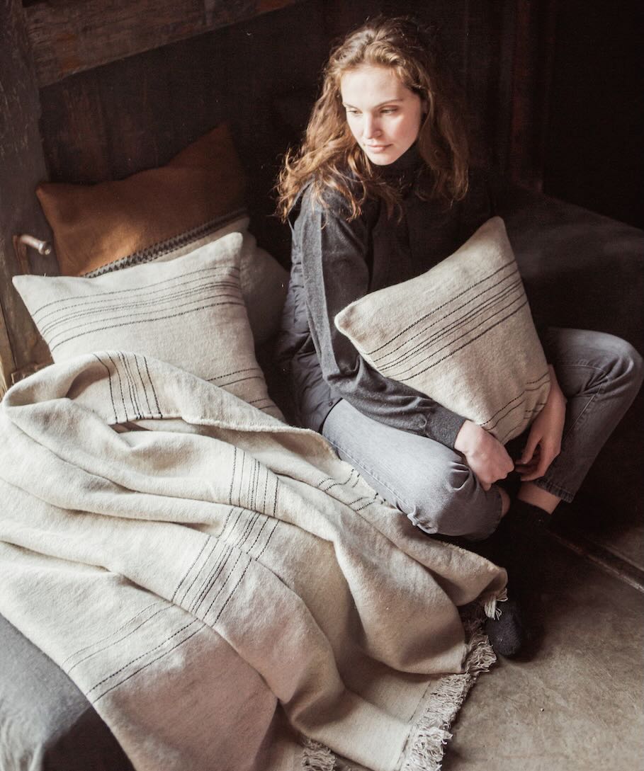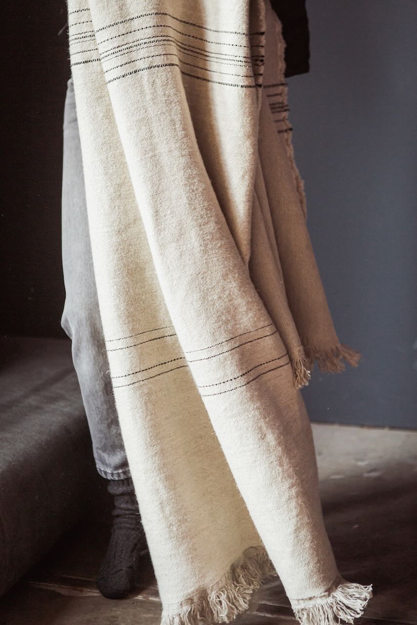 Dieses schöne Plaid von Libeco hat ein ausgesprochen schlichtes einfaches aber sehr eindrückliches Design. Die hochwertige Decke ist ganz in warmem Beige gehalten, der durch in verschiedenen Abständen eingewebte schwarze Streifen prägnant durchbrochen wird. Durch die gewaschene Leinen-Wollmischung und die grobe Gewebestruktur hat das edle Plaid eine weiche angenehme Haptik. Eine sehr schlichte und hochwertige Decke für alle Wohnbereiche.