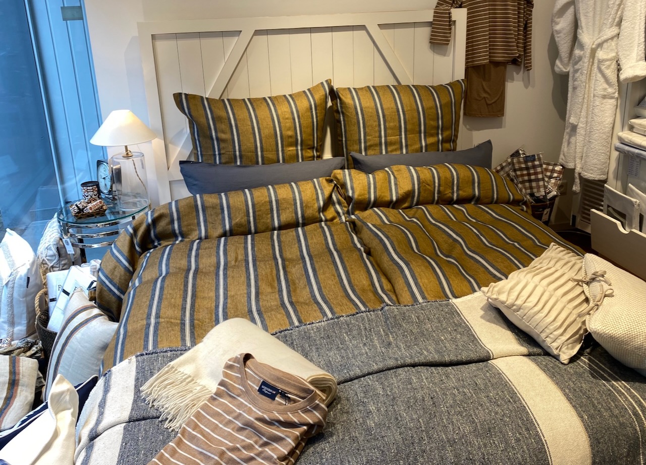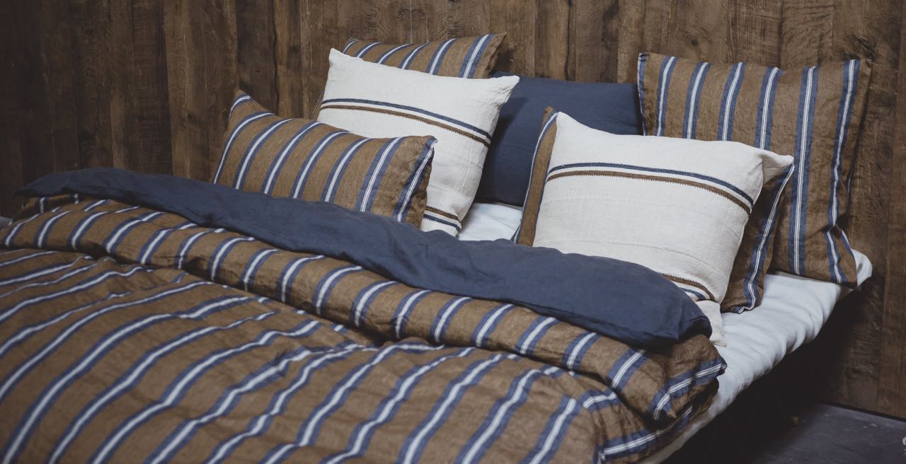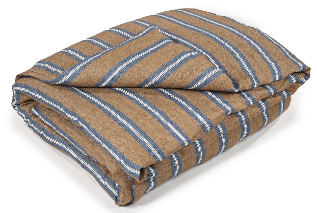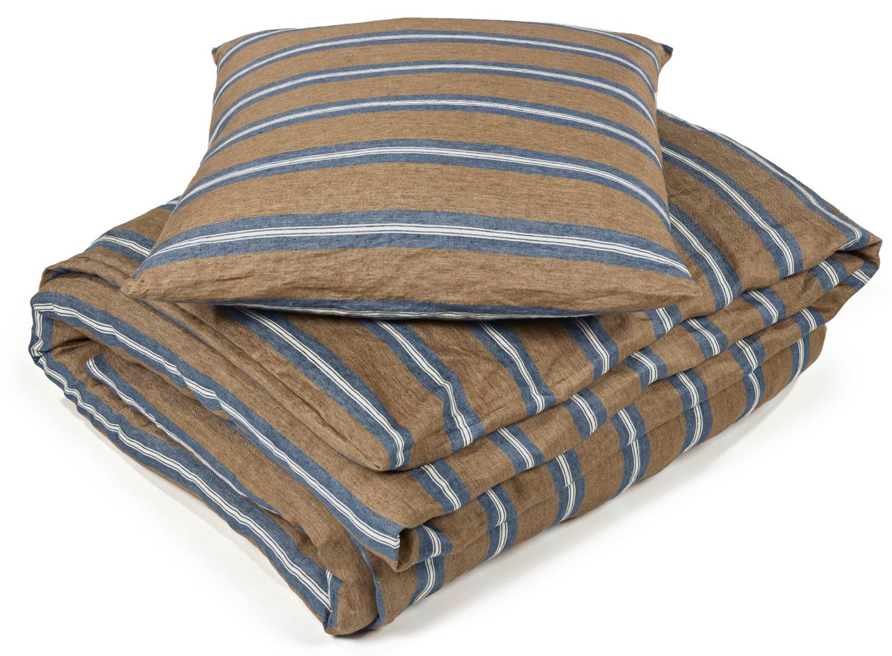 Diese edel-lässige Leinen-Bettwäsche von Libeco besticht durch die dekorativen marine-wollweissen Streifen auf braunem Grund. Durch die edle Farbzusammenstellung hat die Bettwäsche eine warme und zugleich frische Optik und setzt mit ihrem schimmerndem Glanz ganz besondere Akzente. Das vorgewaschene Leinen ist angenehm weich und anschmiegsam und sorgt durch seine feuchtigkeitsregulierende und temperaturausgleichende Eigenschaft für ein sehr gutes Schlafklim. Der Kissenbezug ist mit einem schlichten Hotelverschluß, der Bettbezug mit einer verdeckten Knopfleiste gearbeitet.