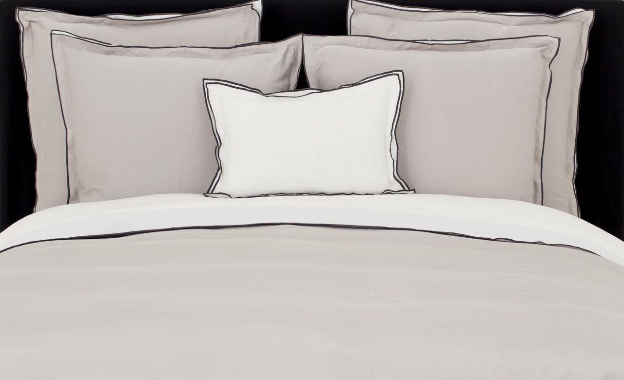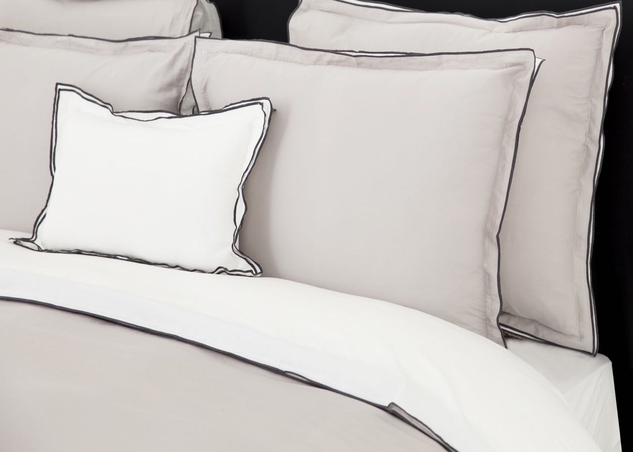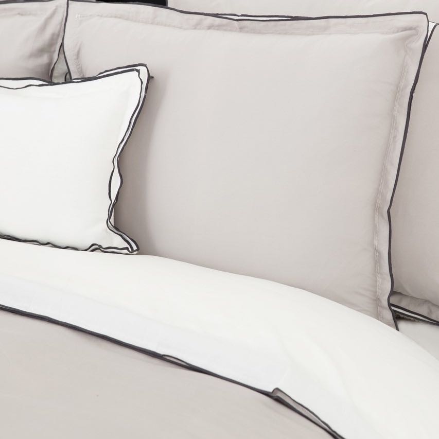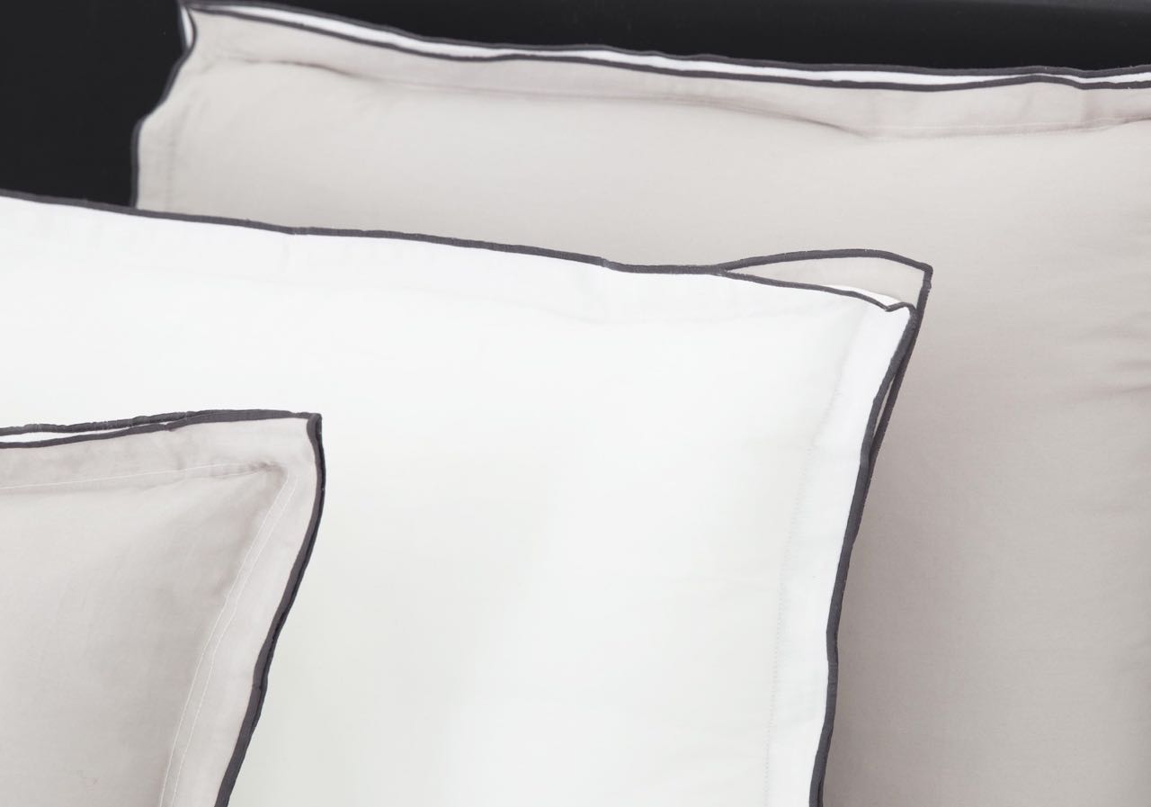 Diese edle Bettwäsche Zen von Flamant besticht durch die schöne Farbkombination aus einem warmen Stoneton auf der einen Seite und einem klaren Weiß auf der anderen Seite des Bettbezugs und des Kissenbezugs. Bettbezug und Kissenbezug haben einen doppelten Stehsaum der durch eine anthrazitfarbene Paspelierung an den Aussenseiten eingefasst wird, was der schönen Bettwäsche eine besondere Raffinesse verleiht. Der feine Baumwollsatin dieser hochwertigen Bettwäsche ist vorgewaschen, wodurch die dekorative Bettwäsche besonders weich und anschmiegsam ist. Kissenbezug und Bettbezug dieser schönen Bettwäsche haben eine dezent verdeckte die Knopfleiste.