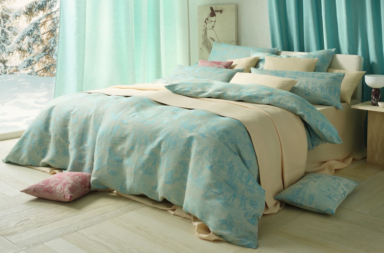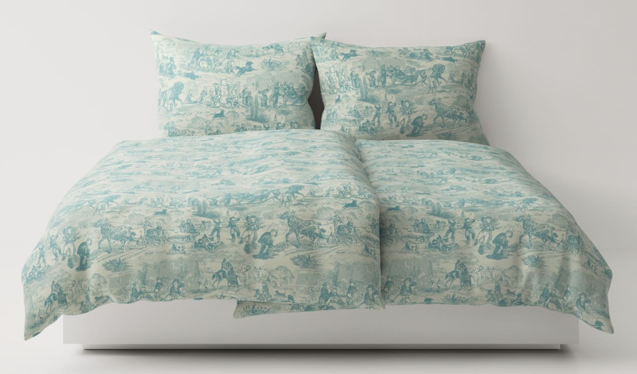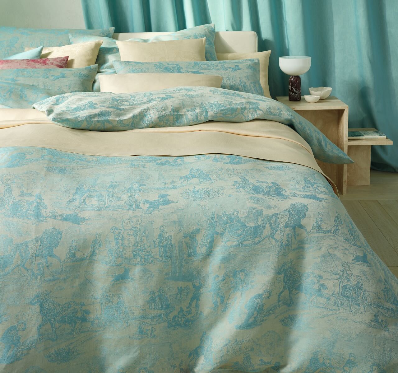 Diese schöne Bettwäsche im Dessin Toile-des-Alpes aus feiner Baumwolle und edlem Leinen von Leitner Leinen entführt in die romantische Winterszenerie der Bergwelt im 18. Jahrhundert. Eine fein gewebte Bettwäsche mit dezenten und harmonisch aufeinander abgestimmten Farben, die mit ihren winterlichen Motiven eine natürliche Leichtigkeit vermittelt.