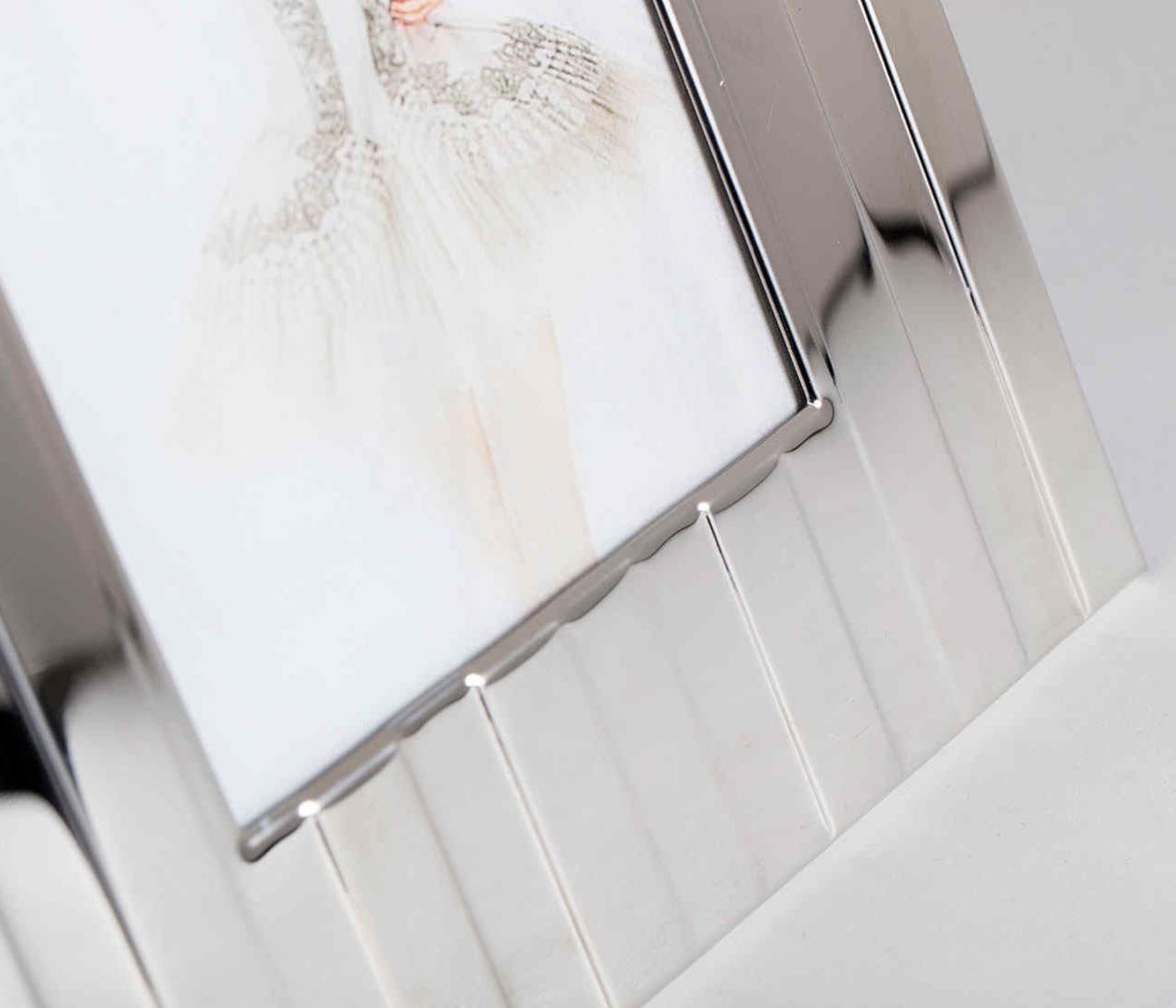 Dieser dekorative Bilderrahmen von Flamant hat ein dezentes Streifenmuster und einen edlen silbernen Schimmer. Der schöne Photorahmen umrahmt das Foto auf besonders dekorative Weise. Den schönen Rahmen gibt es in zwei Größen. Die Aussenmasse des Rahmens betragen 20 x 26 cm.