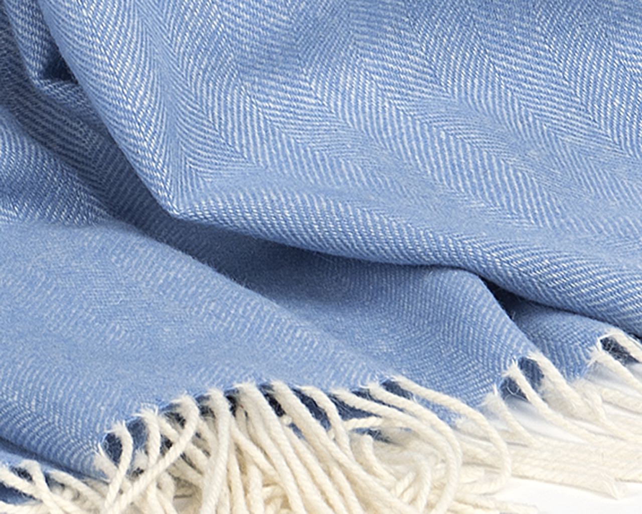 Die schöne Kuscheldecke Classic aus reiner Merinowolle von Thanks a lot ist angenehm leicht und wärmend zugleich. Sie hebt sich heraus durch ihr feines Fischgrät-Webmuster, wodurch der feine Pastellton eine optische Lebendigkeit erhält. Die wollweißen Fransen verleihen dieser hochwertigen Decke eine besondere Note. Eine edle und dekorative Wolldecke für kühlere Stunden. Die Länge der Decke bemisst sich inklusive der Fransen.