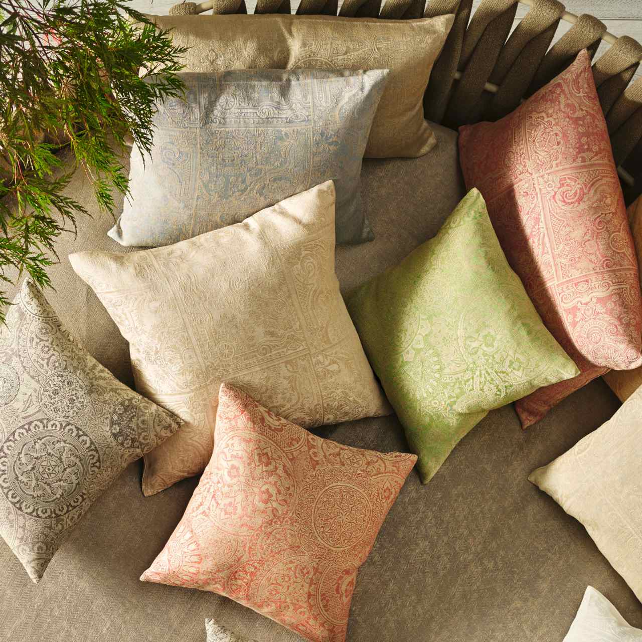 Dieser kunstvoll gewebte Kissenbezug von Leitner Leinen im Dessin Intarsio aus Reinleinen zeigt den Reichtum der Natur in ihrer floralen Vielfalt. Stilisierte Rosen, Tulpen und Gerbera, verbunden durch geschwungene Rauten, Ranken und filigrane Ornamente, kommen durch die fein aufeinander abgestimmten Farben besonders schön zur Geltung und verleihen dem edlen Kissen eine zurückhaltende Eleganz.