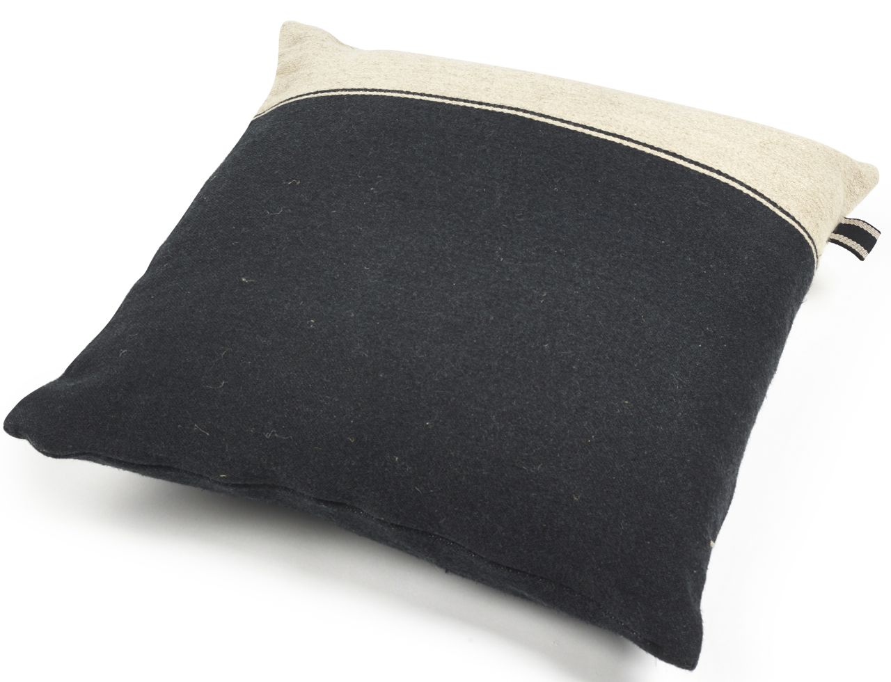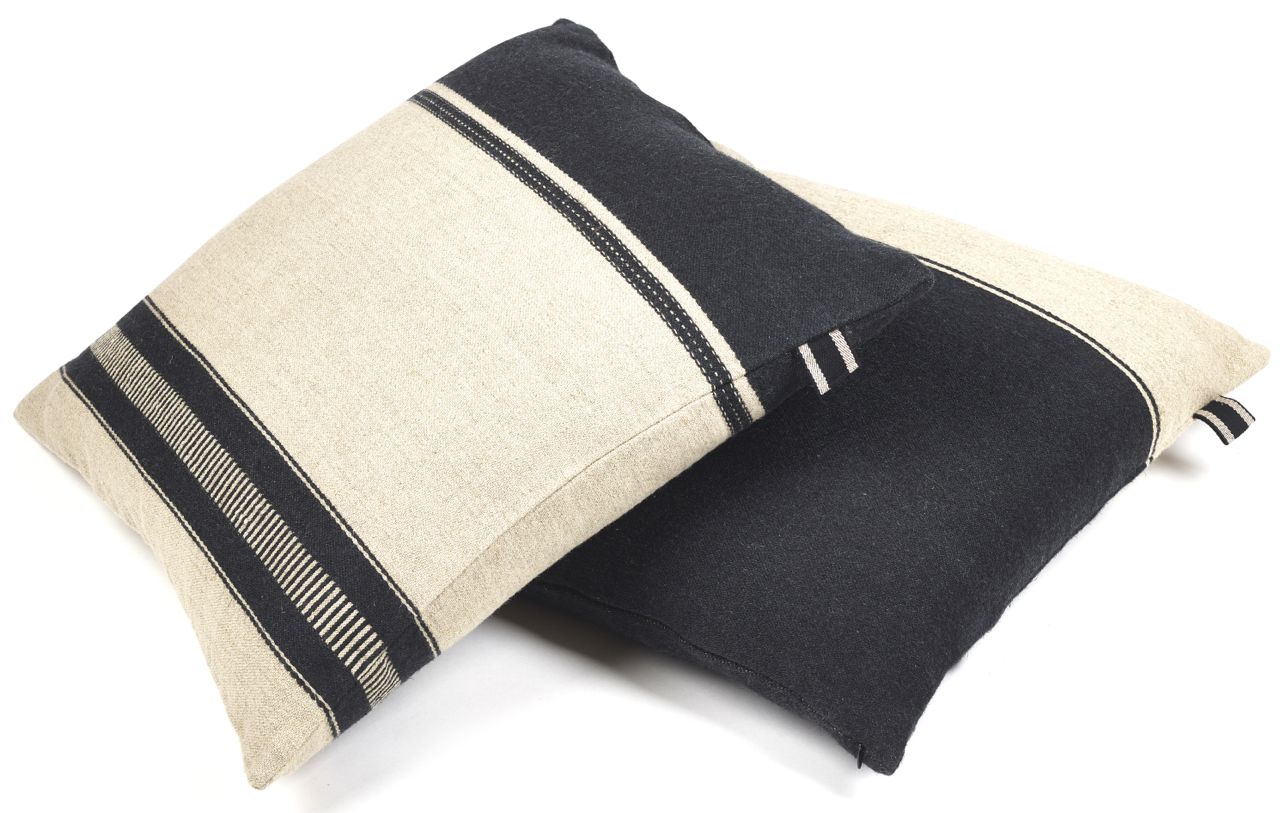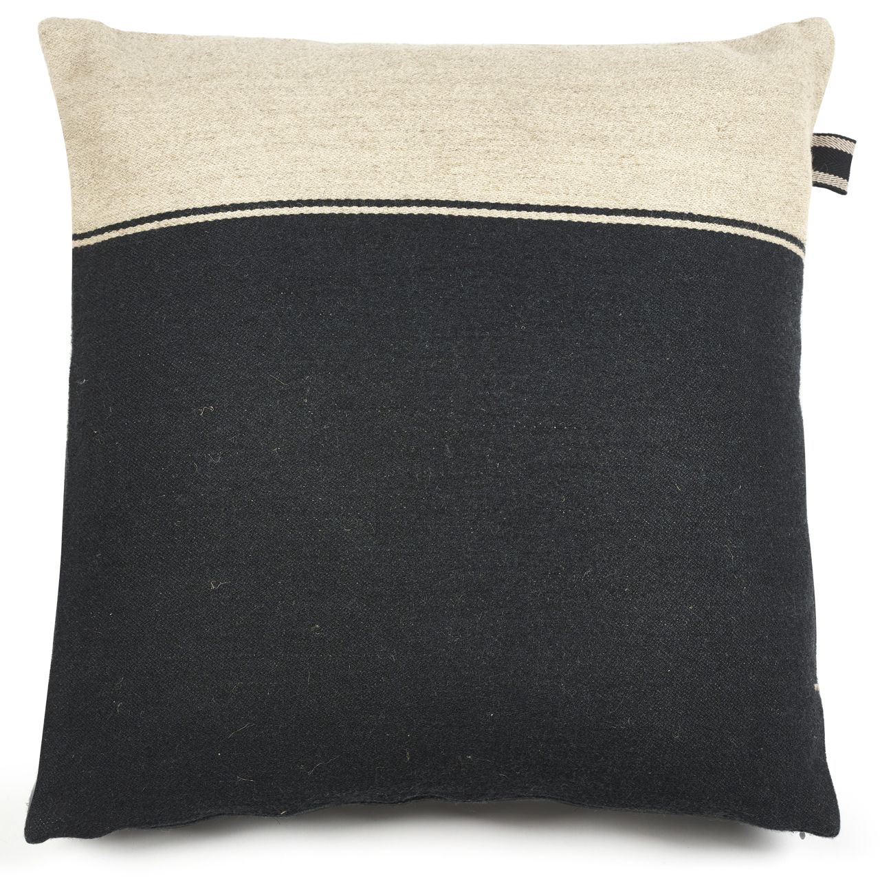 Dieses schöne Kissen von Libeco hat eine ausgesprochen prägnante edle Optik. Der warme Naturton der einen Seite ist durch einen schmalen schwarzen und einen naturfarbenen Streifen vom Schwarz der anderen Seite abgesetzt. Diese kontrastreiche Farbkombination ist ausdrucksstark und gleichzeitig sehr harmonisch. Aus gewaschener Leinen-Wollmischung hergestellt hat der hochwertige Kissenbezug eine grobe Gewebestruktur, die sich weich und angenehm anfühlt. Der Reißverschluss ist verdeckt und unauffällig angebracht. Ein schönes, dekoratives Kissen für alle Wohnbereiche.