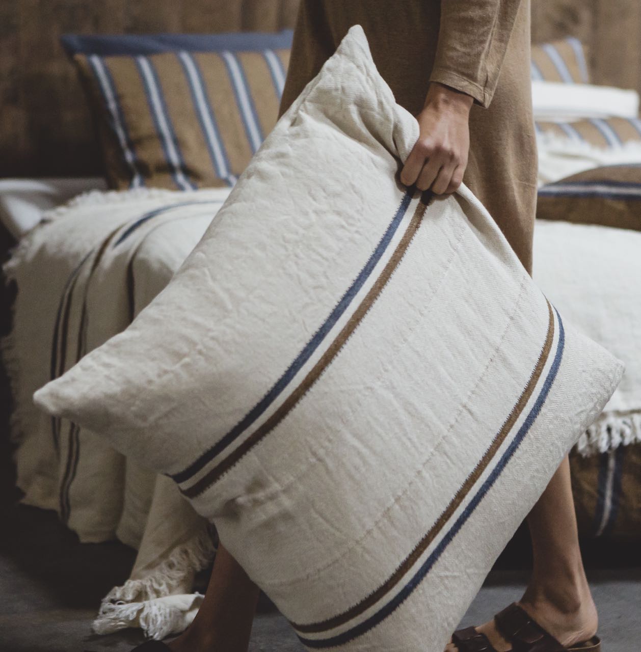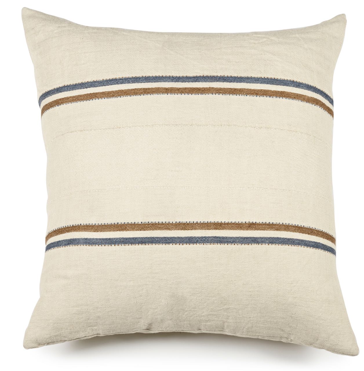 Dieses schöne Kissen von Libeco ist von schlichter lässiger Eleganz. Der edle Kissenbezug hat einen naturfarbenen Grundton mit dekorativen braunen und blauen Streifen. Das gewaschene Leinen des hochwertigen Kissens hat einen leicht schimmernden Glanz und ist angenehm weich und anschmiegsam. Der Reißverschluss ist dezent und unauffällig. Ein dekoratives edles Kissen für Bett und Sofa.