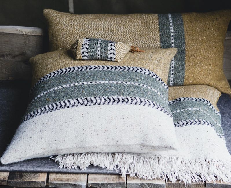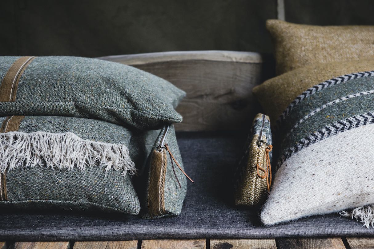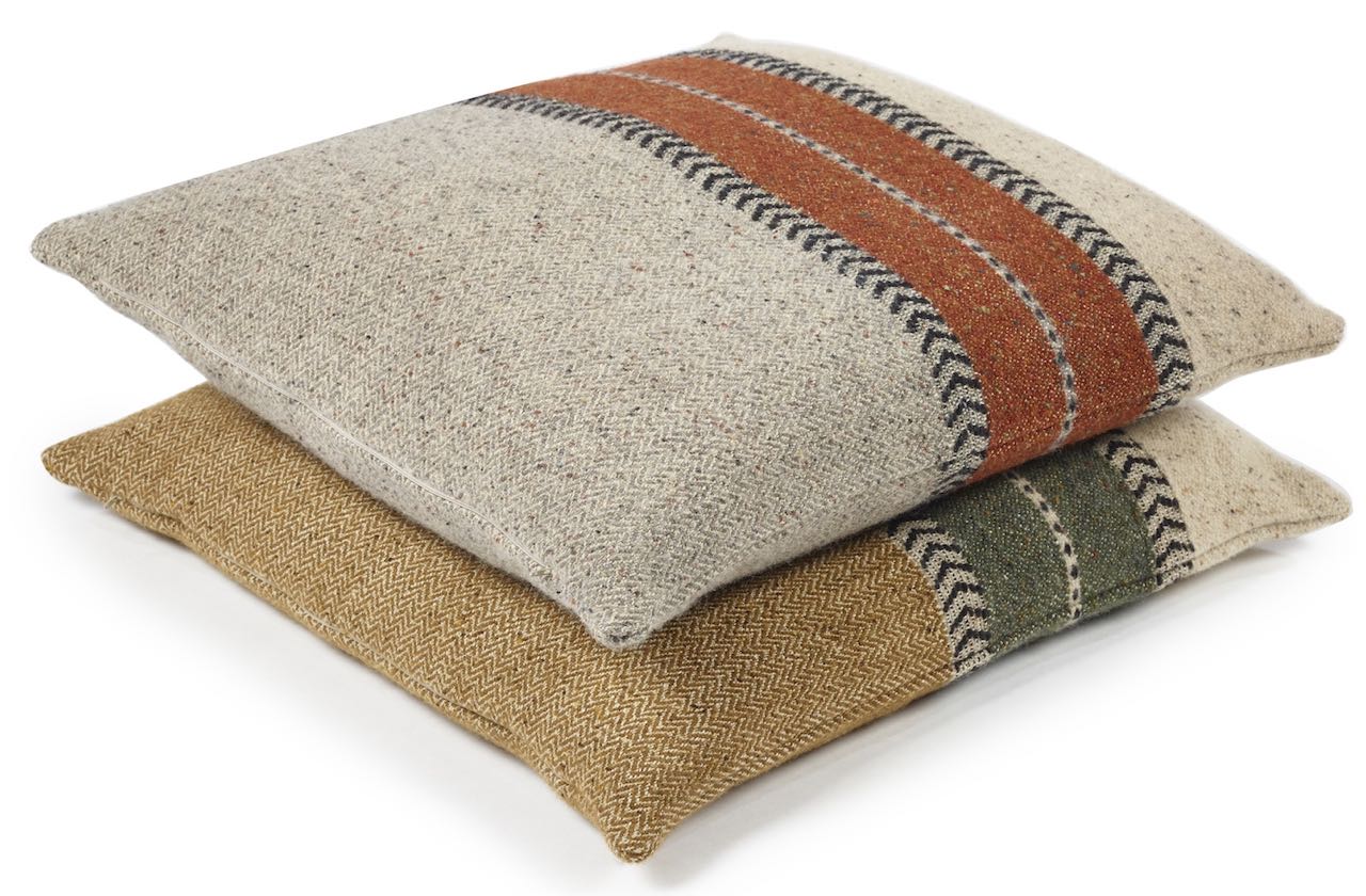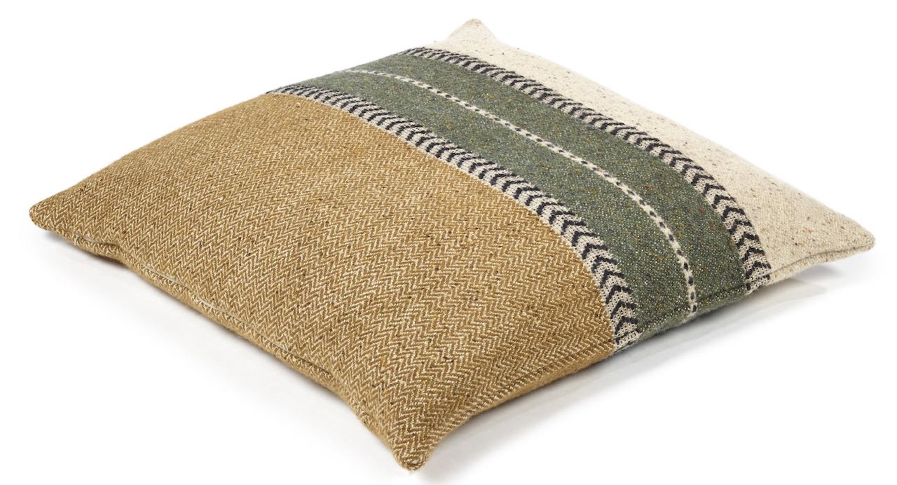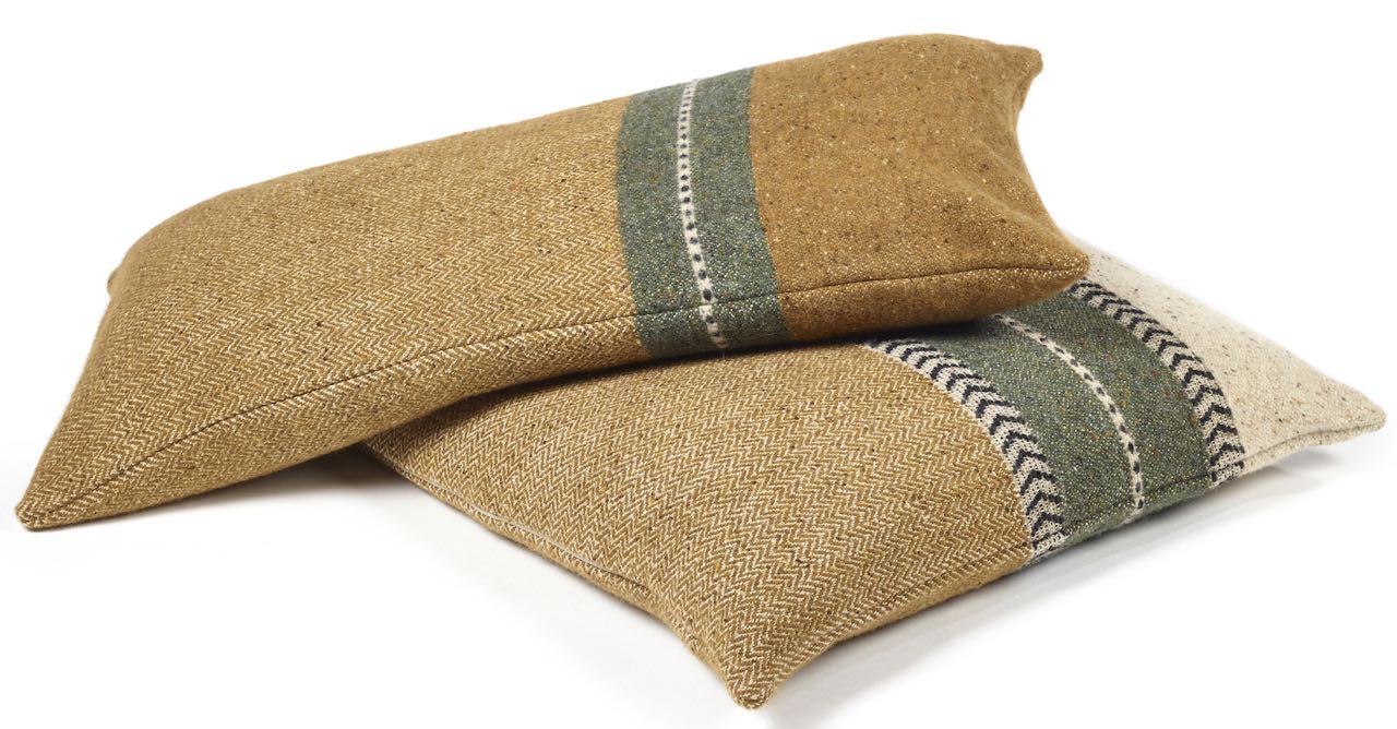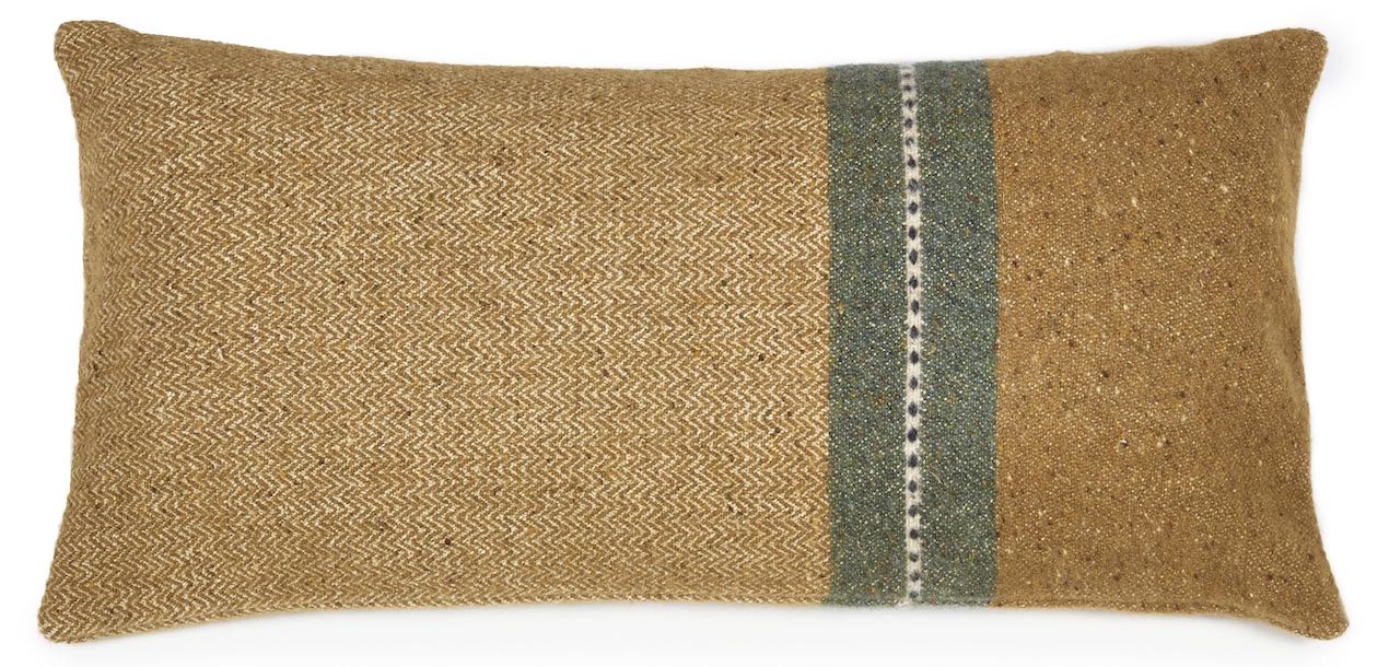 Dieses hochwertige Kissen von Libeco besticht durch die edle Farbkombination aus warmem Camelton, edlem Grün und hellem Beige. Das exklusive Deko-Kissen ist aus einer gewaschenen Leinen-Wollmischung gewebt und hat eine grobe Gewebestruktur mit weicher angenehmer Oberfläche. Das edle Kissen hat eine interessante Mischung aus Fischgrätmuster und Leinwandbindung und zwei dekorative Streifen in Grün und Beige. Geschlossen wird das schöne Kissen mit einem dezenten Reissverschluß.