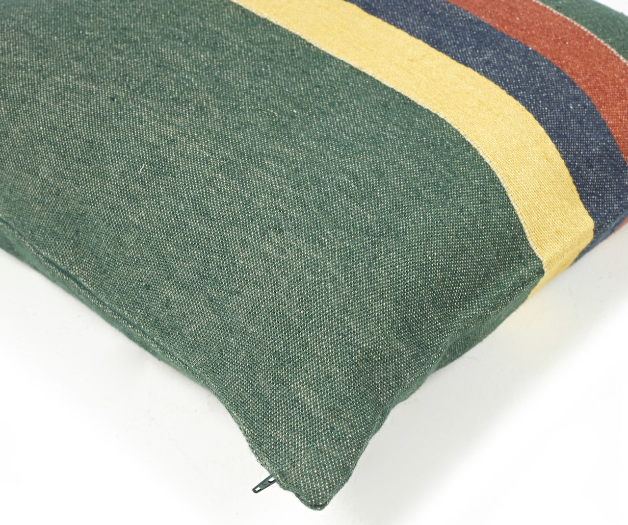 Der hochwertige Kissenbezug Harlan Stripe von Libeco ist edel und lässig zugleich Durch das vorgewaschene Leinen ist der schöne Kissenbezug angenehm weich und anschmiegsam und hat einen besonders feinen Glanz. Die schöne Farbkombination des edlen Kissenbezugs aus blauen, gelben und rostroten Streifen auf grünem Grund verleiht der Umgebung eine warme und frische Optik. Der Kissenbezug wird mit einem dezenten Reißverschluss geschlossen.