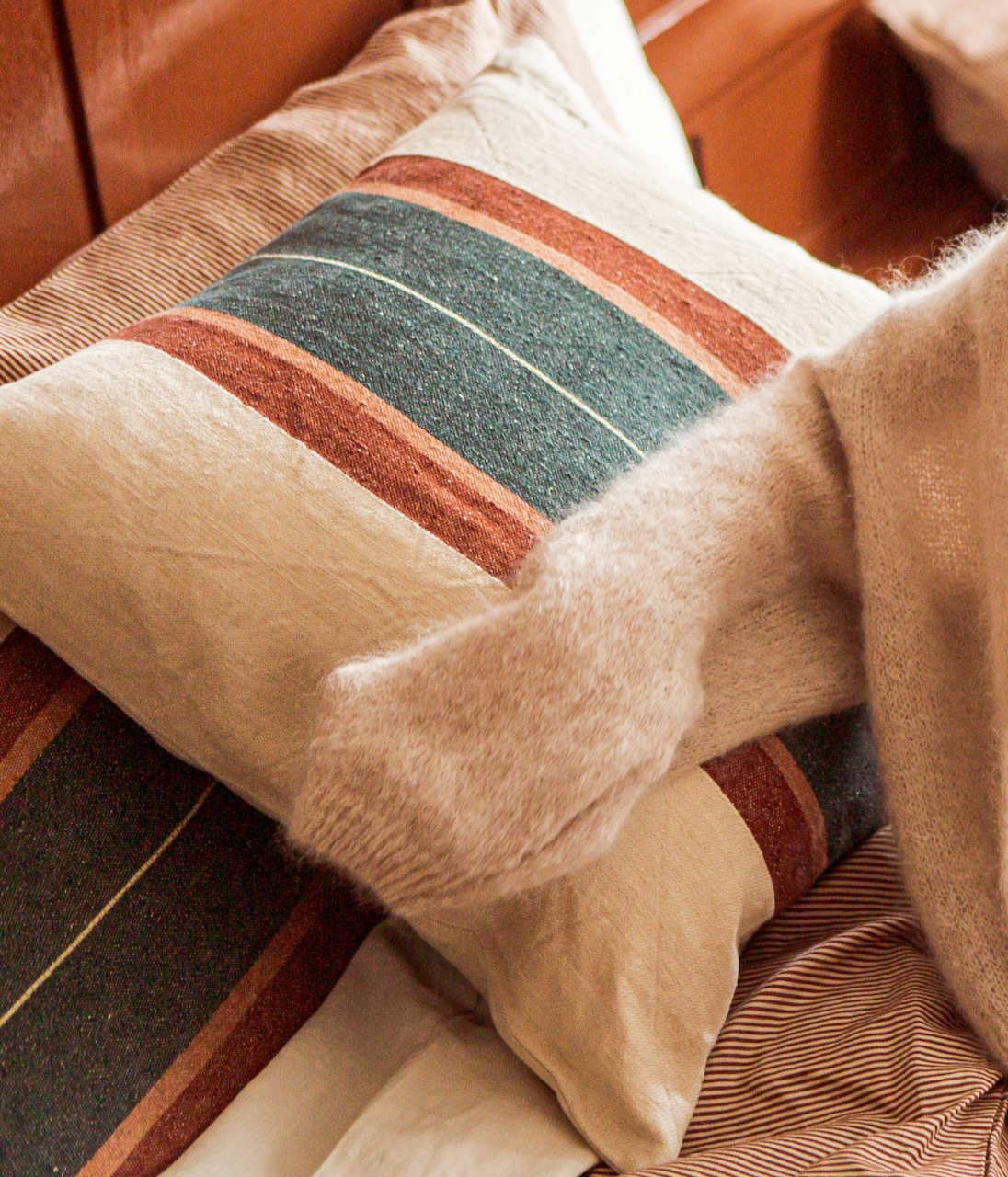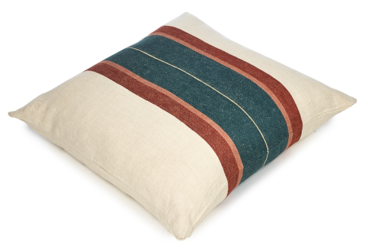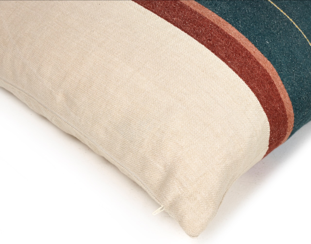 Dieses schöne Kissen von Libeco ist von sportlich lässiger Eleganz. Der edle Kissenbezug hat einen naturfarbenen Grundton mit dekorativen grünen, braunen und rosafarbenen Streifen. Das gewaschene Leinen des hochwertigen Kissens hat einen leicht schimmernden Glanz und ist angenehm weich und anschmiegsam. Der Reißverschluss ist dezent und unauffällig. Ein dekoratives edles Kissen für Bett und Sofa.
