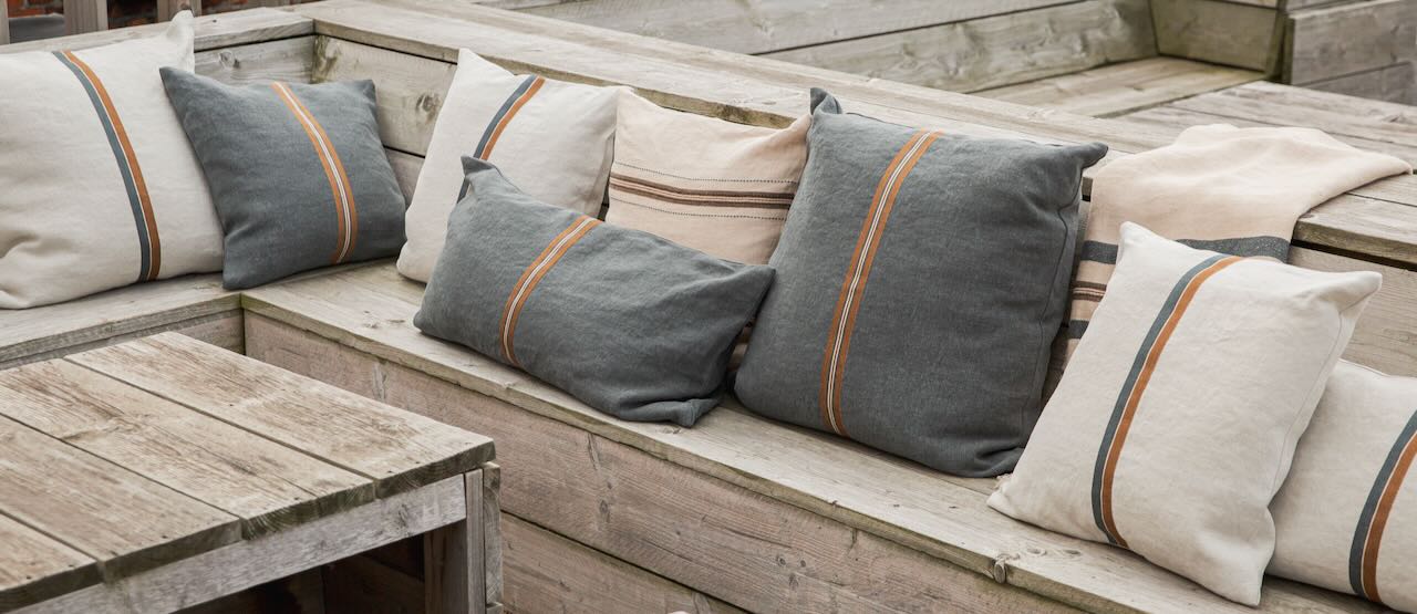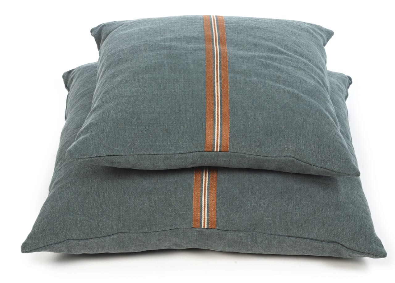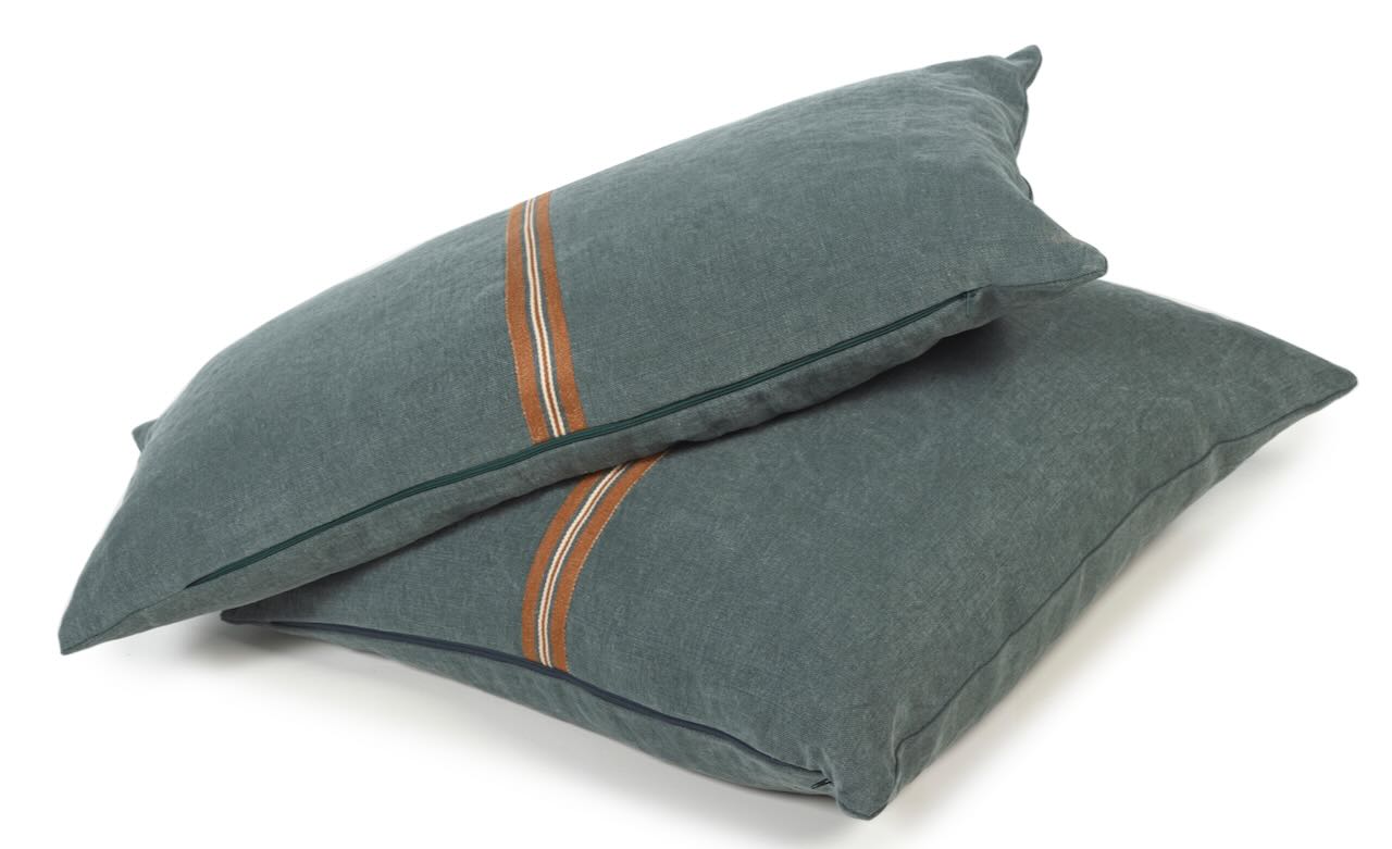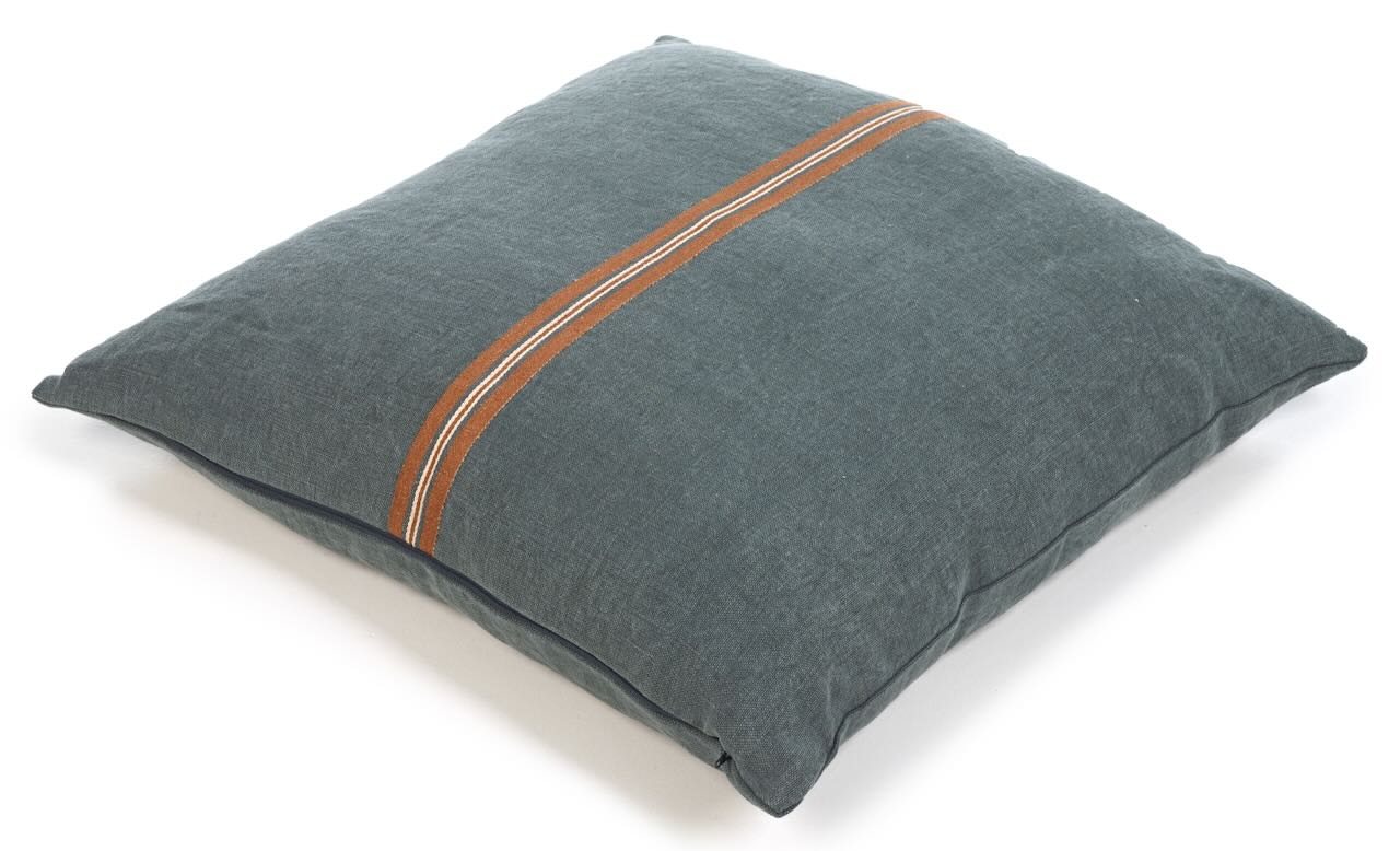 Dieses edel-lässige Kissen von Libeco ist dekorativ und strapazierfähig zugleich. Durch das stonewashed Leinen ist dieses exklusive Kissen sehr strapazierfähig und hat gleichzeitig einen edlen"Used Look".Auf der Vorderseite des grün-grauen Kissenbezugs ist eine gestreifte braun-beige-grüngraue Leinen-Bördüre aufgenäht und verleiht dem hochwertigen Kissen eine ganz besondere Optik. Ein legeres und dekoratives Kissen für Drinnen und Draußen. Zum edel-lässigen Stil passt der dezente Reißverschluss.