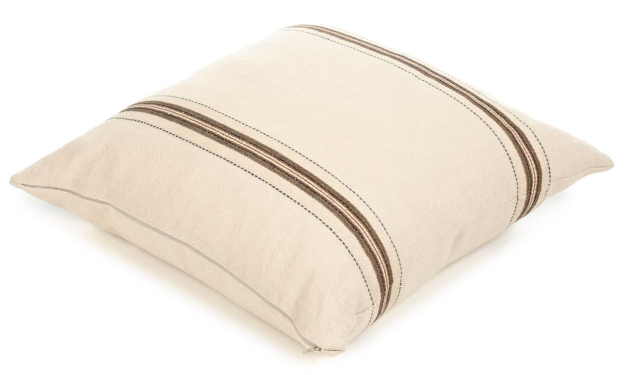 Dieses schöne Kissen von Libeco ist von schlichter lässiger Eleganz. Der edle Kissenbezug hat einen naturfarbenen Grundton mit dekorativen feinen grün-grauen, braunen und schwarzen Streifen. Das gewaschene Leinen des hochwertigen Kissens hat einen leicht schimmernden Glanz und ist angenehm weich und anschmiegsam. Der Reißverschluss ist dezent und unauffällig. Ein dekoratives edles Kissen für Bett und Sofa.