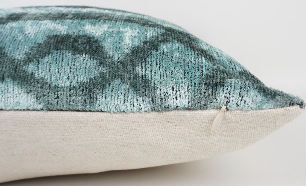 Dieses hochwertige Seidenkissen von Thanks a lot besticht durch das fein glänzende Muster in dezenten Aquatönen. Der schöne Kissenbezug wird auf der Vorderseite aus feinem Seiden-Samt und auf der Rückseite aus unifarbenem Leinen-Baumwoll-Gewebe hergestellt. Dieses edle Kissen ist ein wahres Highlight, das im Wohn- oder Schlafbereich tolle Akzente setzt und der Umgebung eine ganz besondere Note verleiht. Mit dem verdeckten schmalen Reißverschluss lässt sich der Kissenbezug dezent schließen.