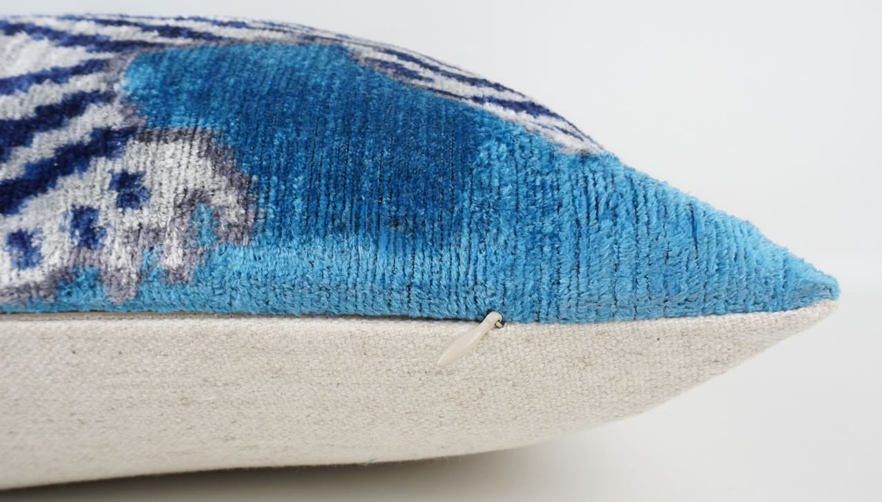 Dieses hochwertige Seidenkissen von Thanks a lot besticht durch das tolle, leicht glänzende Motiv in frischen Blautönen. Der schöne Kissenbezug wird auf der Vorderseite aus feinem Seiden-Samt und auf der Rückseite aus unifarbenem Leinen-Baumwoll-Gewebe hergestellt. Dieses edle Kissen ist ein wahres Highlight, das im Wohn- oder Schlafbereich tolle Akzente setzt und der Umgebung eine ganz besondere Note verleiht. Mit dem verdeckten schmalen Reißverschluss lässt sich der Kissenbezug dezent schließen.