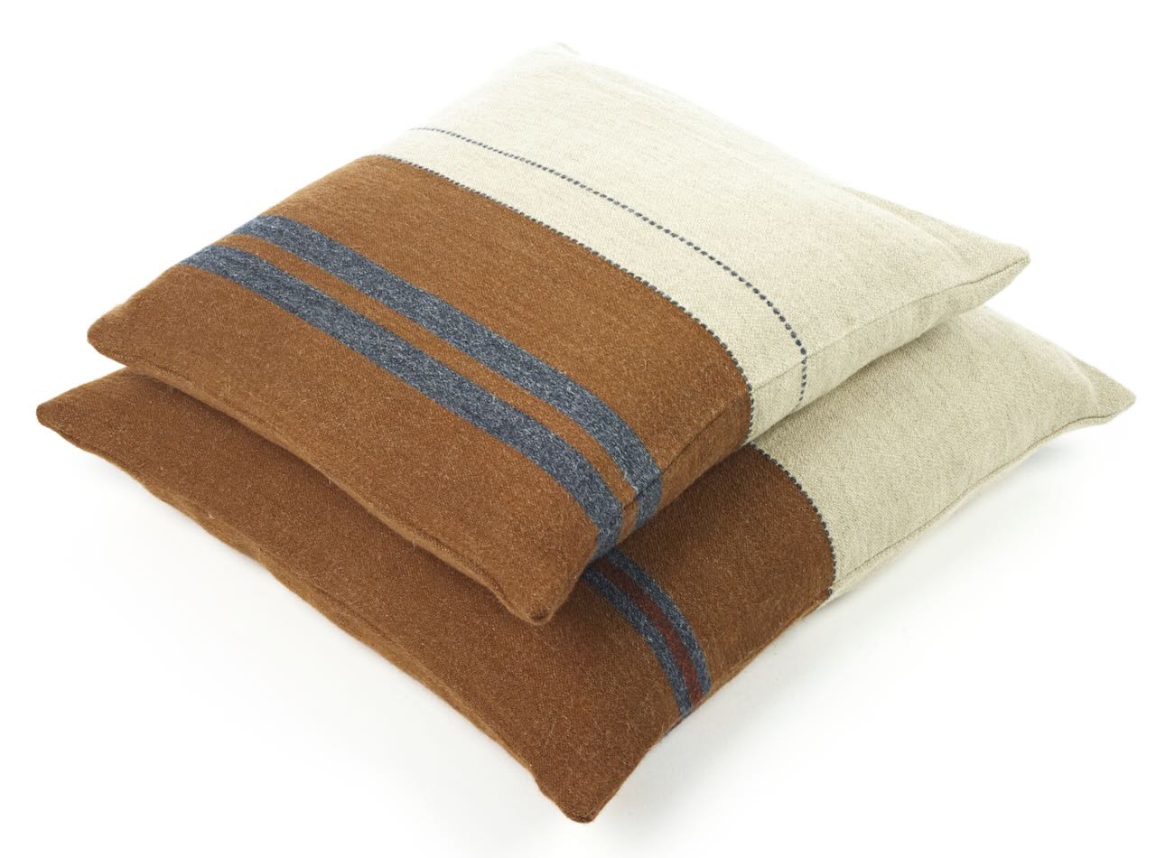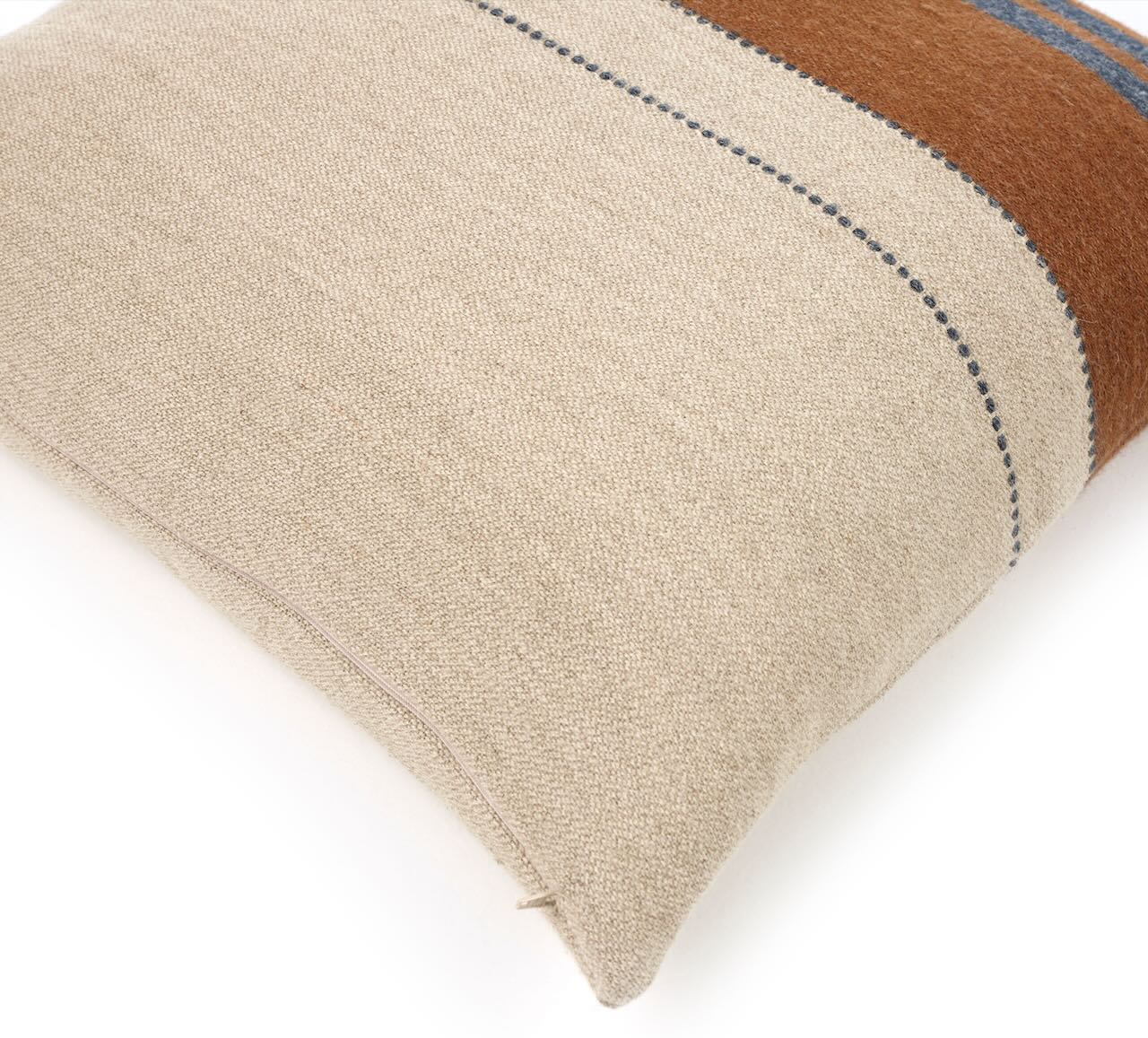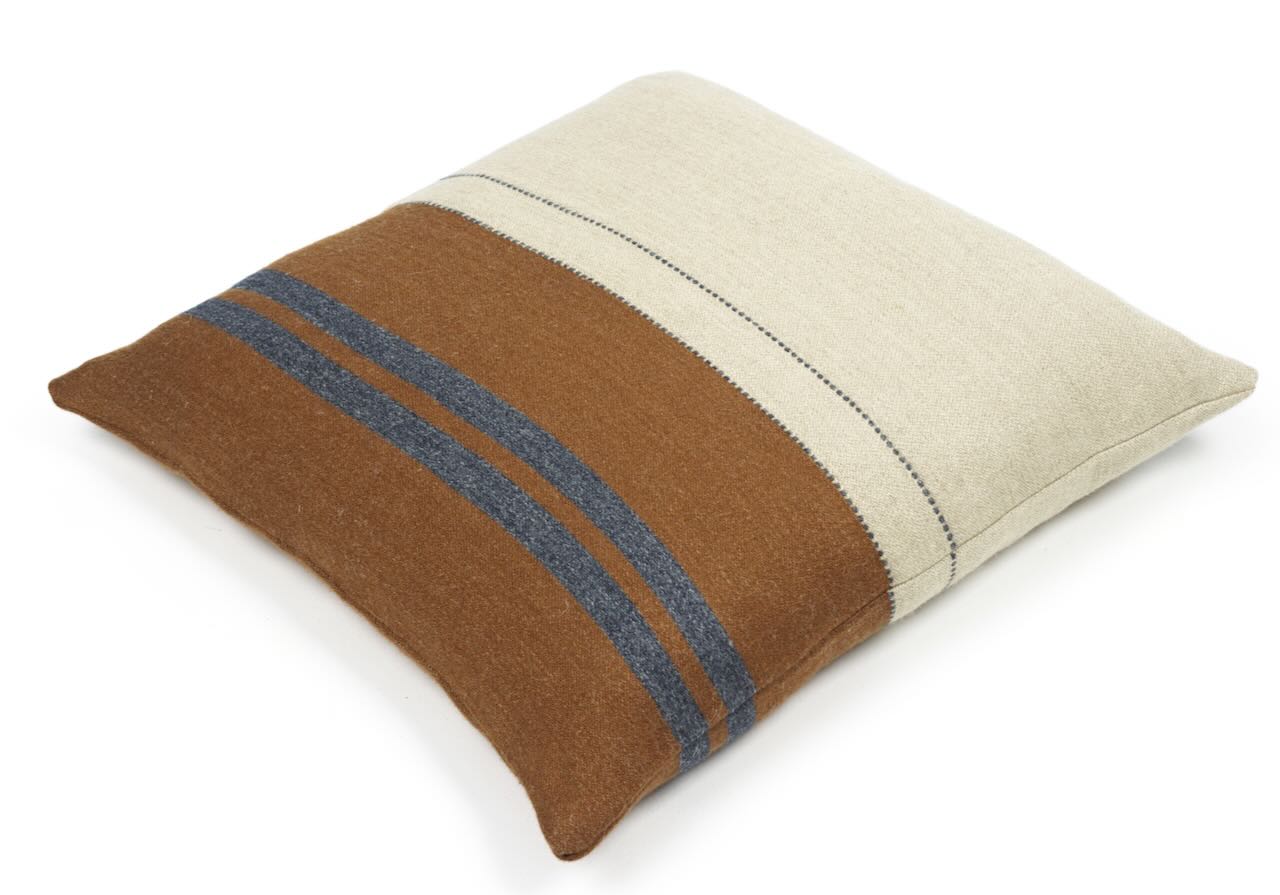 Dieses schöne Kissen von Libeco besticht durch den edlen Braunton in Kombination mit warmem Natur und Rauchgrau. Das hochwertige Kissen hat einen naturfarbenen und einen braunen Bereich. Der naturfarbene Bereich wird durch einen feinen anthrazitfarbenen Streifen, der braune Bereich durch zwei rauchgraue Streifen durchbrochen. Durch die grobe Gewebestruktur der gewaschenen Leinen-Wollmischung hat das hochwertige Kissen eine schöne rustikale Optik und eine weiche angenehme Oberfläche. Der Reißverschluss ist kaum sichtbar eingearbeitet. Ein lässig edles Kissen für alle Wohnbereiche.