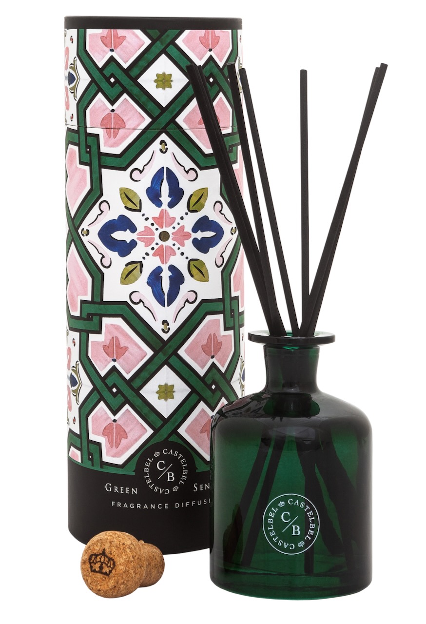 Das edle Duftbouquet Grüner Sencha von Castelbel ist ein ganz besonderes Geschenk. Die feine Duftkreation aus mildem grünem Tee verleiht dem edlen Diffuser eine herb frische Note und der Umgebung eine schöne feine Brise. Das edle Duftbouquet hat ein hochwertiges grünes Glasgefäß und ist in einer edlen Kartondose mit traditionellem portugiesischem Kachelmotiv verpackt.
